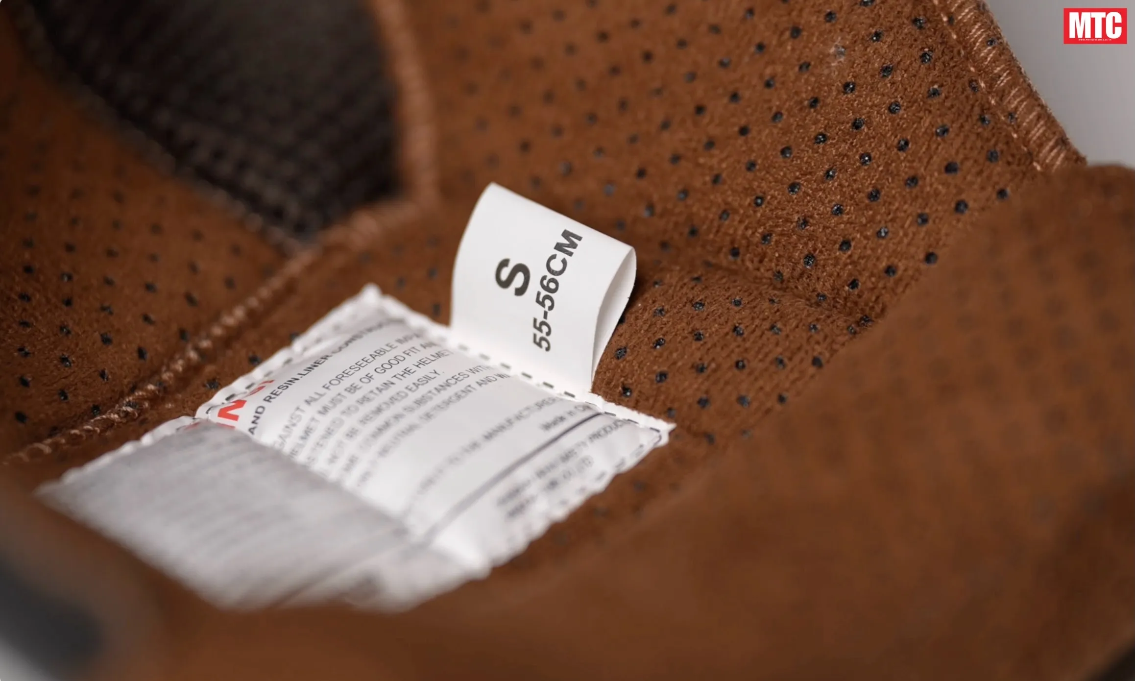 - นวมภายในสีน้ำตาล สามารถถอดออกซักได้ เป็นผ้าหนังกลับแบบพิเศษ Faux Suede Liner พร้อมฉลุรูด้านในเพื่อช่วยระบายอากาศ ส่วนขอบนวมก็มีการเย็บเดินด้ายที่สวยงาม