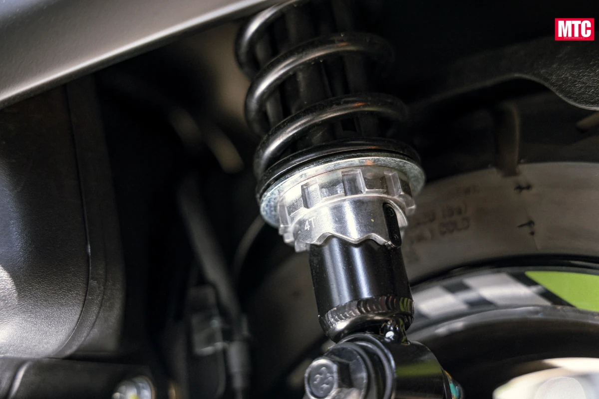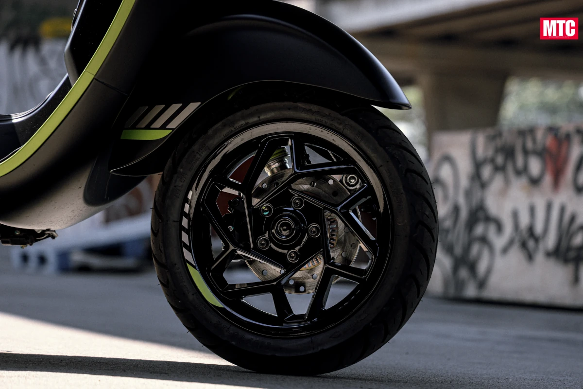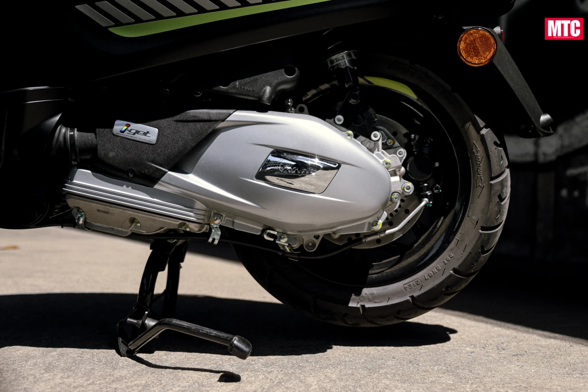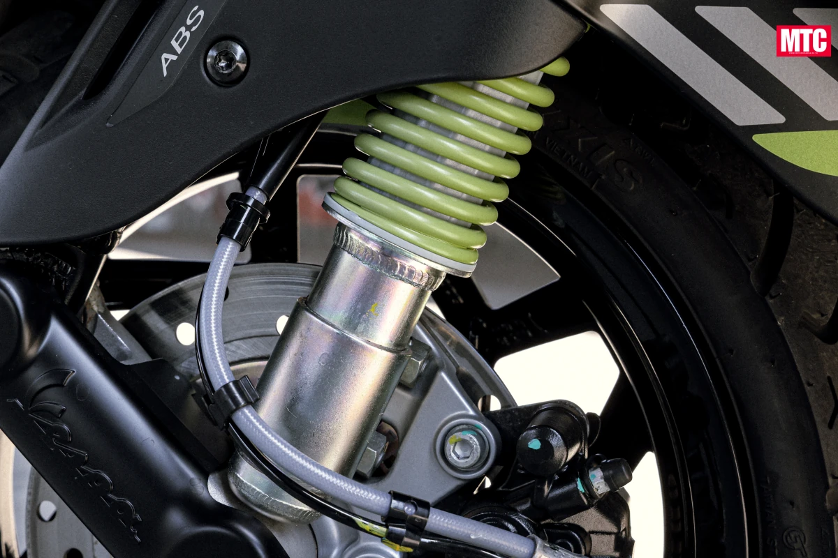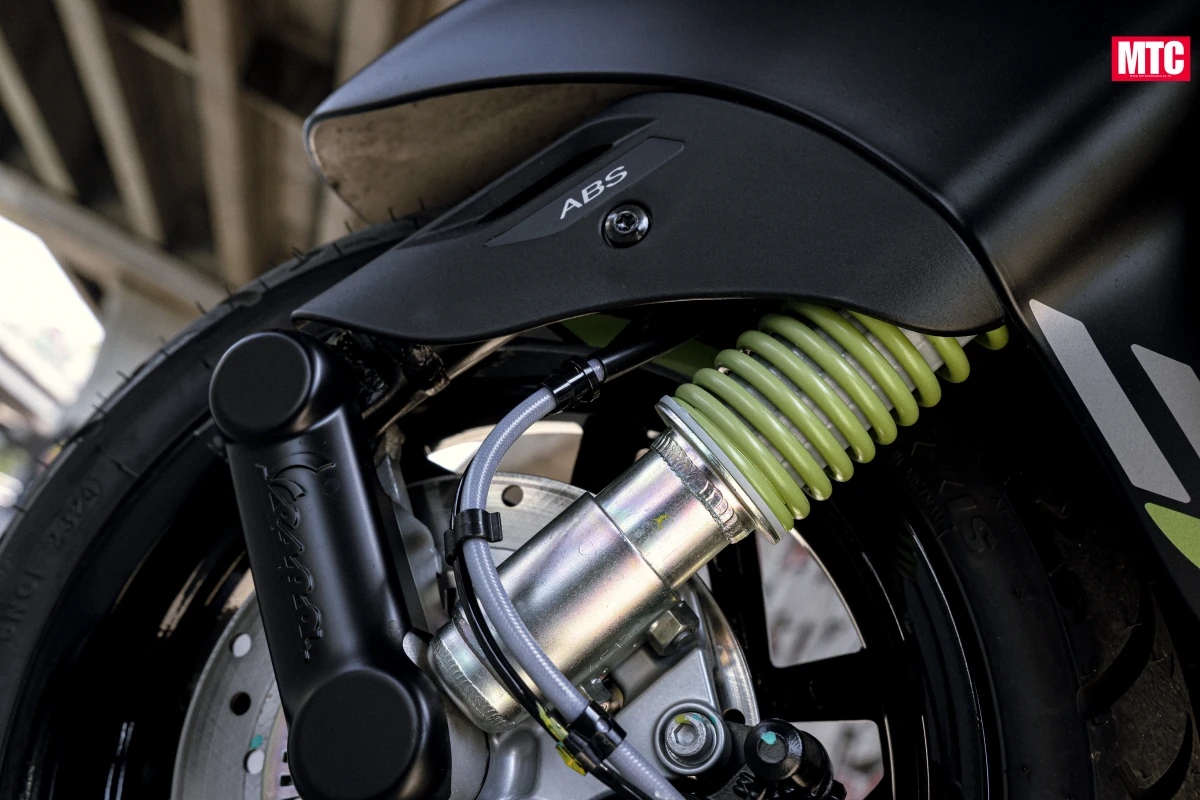 ประเด็นต่อมาถือเป็นเรื่องที่ขาดไม่ได้ สำหรับการค้นหาฟีลลิ่งของรถทุกรุ่น คือจับอาการช่วงล่าง ซึ่งตรงนี้บอกเลยว่าน่าสนใจ เพราะตัวตนแท้ ๆ แบบ Vespa ไซส์เล็ก มักจะใช้ “โช้คเดี่ยวหน้า-หลัง” ตามสเปค โช้คหน้าไฮดรอลิกแบบแขนเดี่ยวทํางานสองทิศทางกับโช้คอัพหลังเดี่ยว โดยในส่วนของโช้คหลังสามารถปรับสปริงพรีโหลดได้ 4 ระดับ