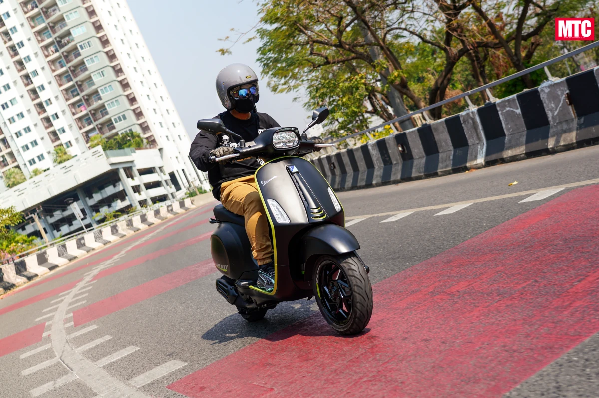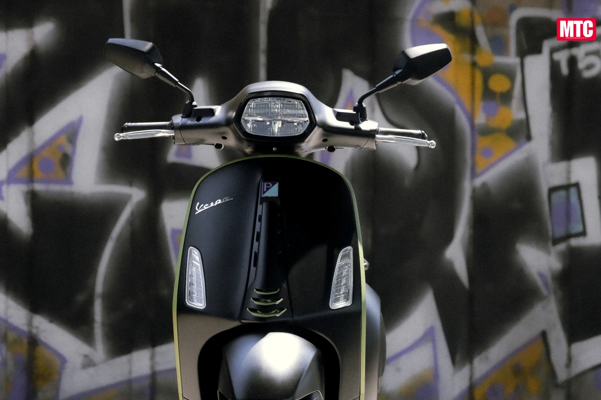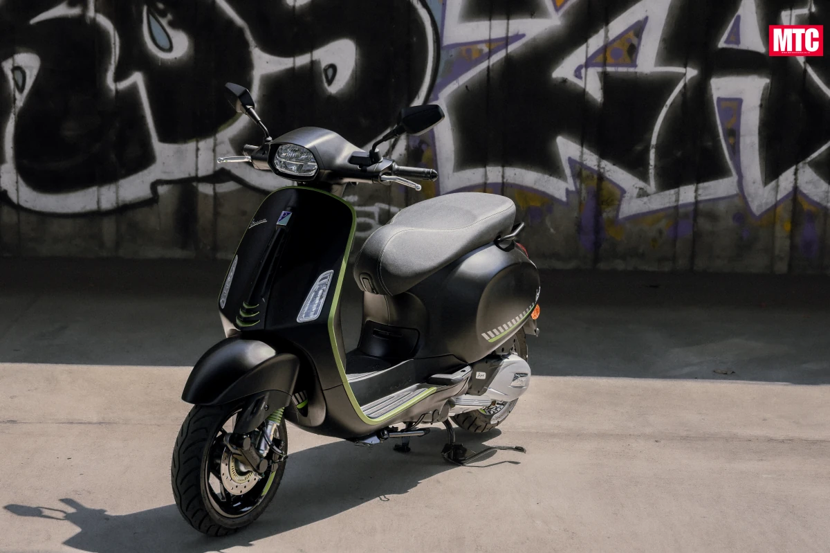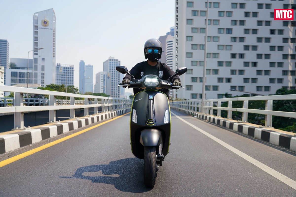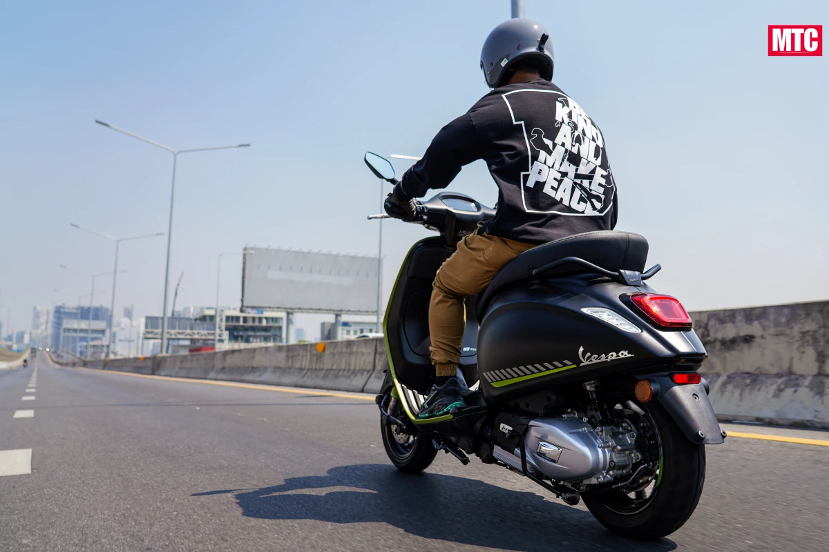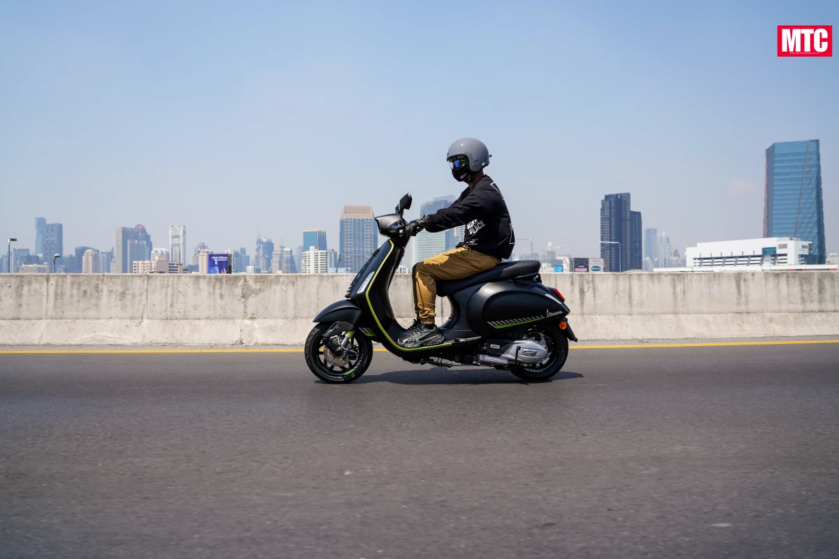 เวสป้ายังรักษาสไตล์การขับขี่เอาไว้อย่างน่าสนใจ เพราะทุกรุ่นที่เคยทดสอบ เราจะพบว่าไม่มีคันไหน “นั่งเตี้ย” เลย ดังนั้นความสูงเบาะ 790 มม. ที่จัดว่าสูงสำหรับคนร่างเล็ก แต่ยังนั่งสบายด้วยเบาะหนังคุณภาพดี เดินแนวด้ายเย็บสีเขียว ทำทรงเบาะให้เรียวและซ่อนความสโลปเอาไว้ ตำแหน่งเบาะคนซ้อนกว้างนั่งสบาย ตำแหน่งคนขี่หัวเบาะค่อนข้างแคบเลยไม่มีปัญหากับการคอนโทรลรถ