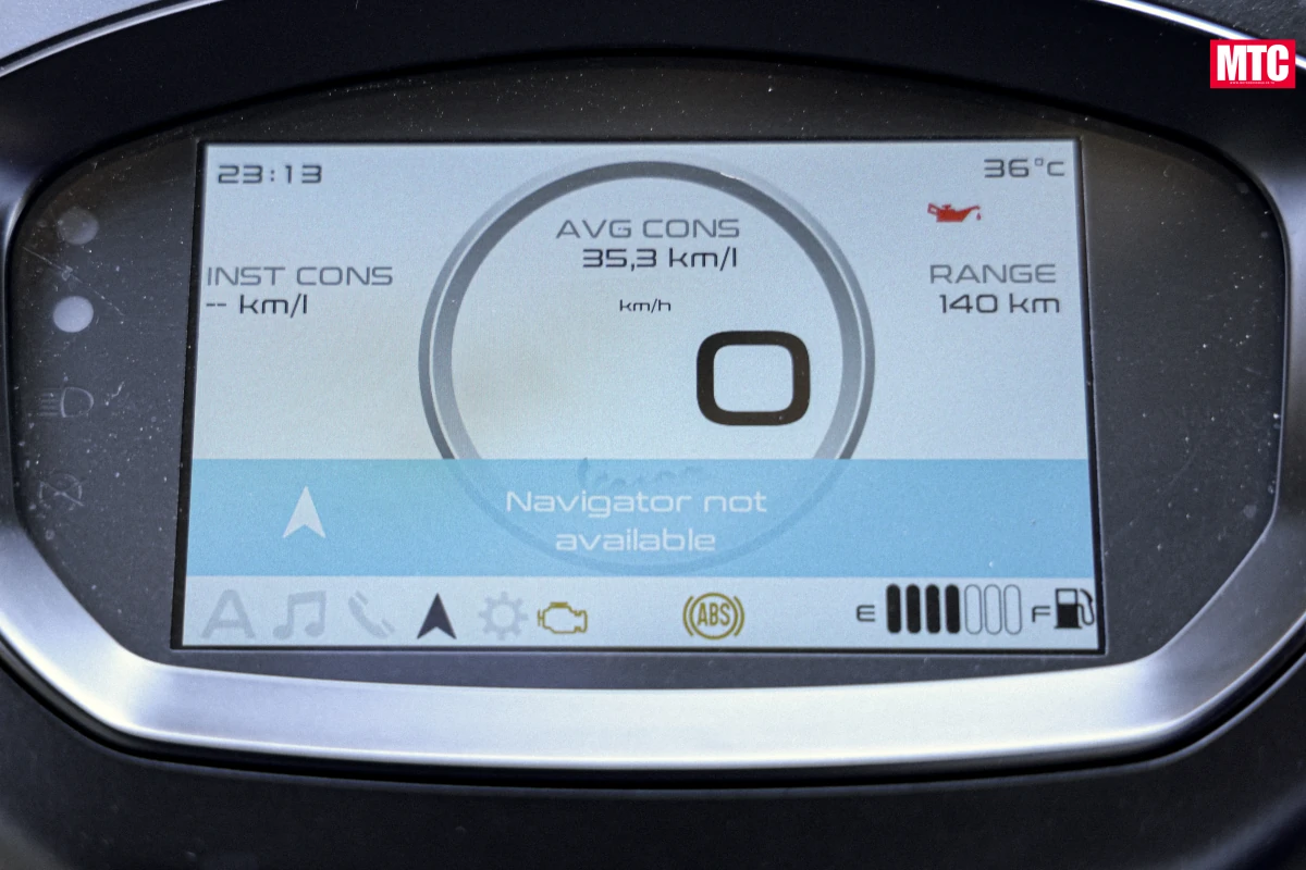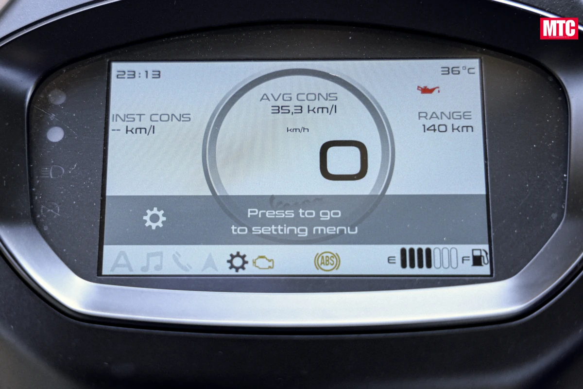 ขณะเดียวกันในหน้าจอใหม่ ให้รายละเอียดการเซ็ทอัพและการแสดงผล รองรับความสะดวกของผู้ใช้งานได้ดีเยี่ยม มีให้ใช้ครบถ้วนมากๆ เช่น เซ็ททริปได้ กดดูตัวเลขความเร็วท็อปสปีดแบบเรคคอร์ดเอาไว้ได้ แรงดันแบตเตอรี่ อัตราสิ้นเปลืองเชื้อเพลิงแบบเฉลี่ยรวมและเรียลไทม์ ระยะทาง (Range) จากปริมาณน้ำมันในถัง แถบระดับเชื้อเพลิง นาฬิกา ฯลฯ โดยการปรับค่าหน้าจอต้องใช้ปุ่มที่แฮนด์ฝั่งขวาตามสไตล์เวสป้า