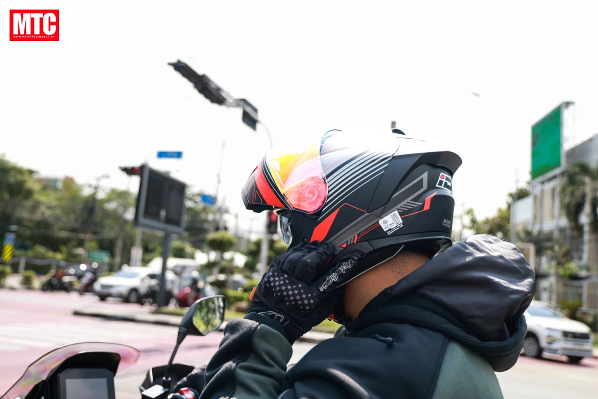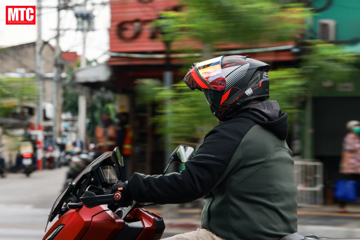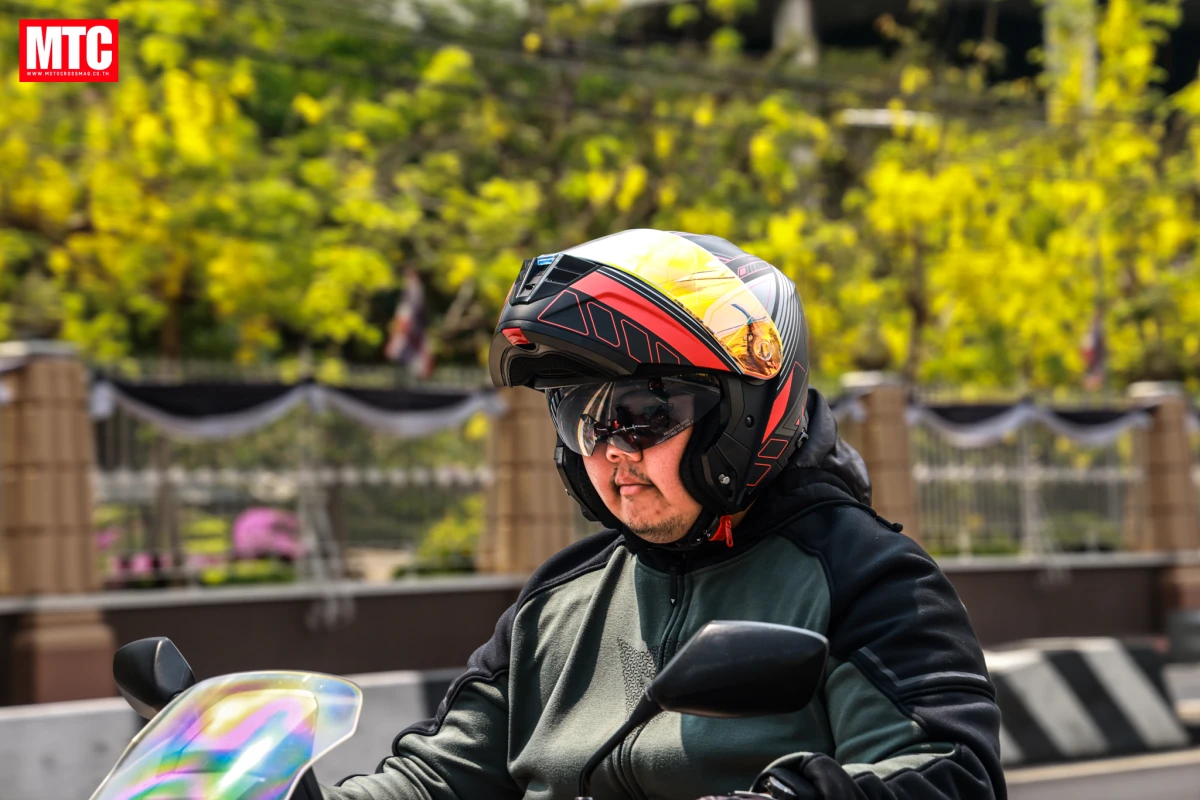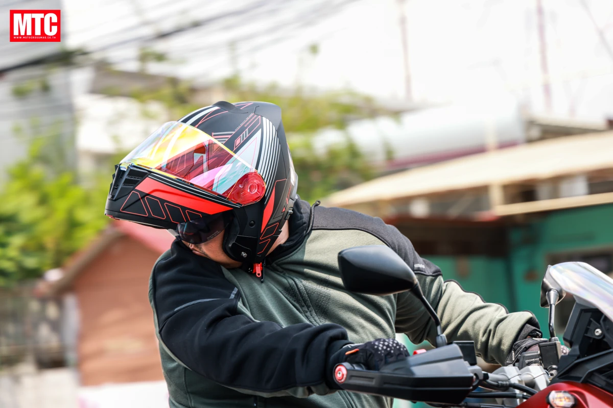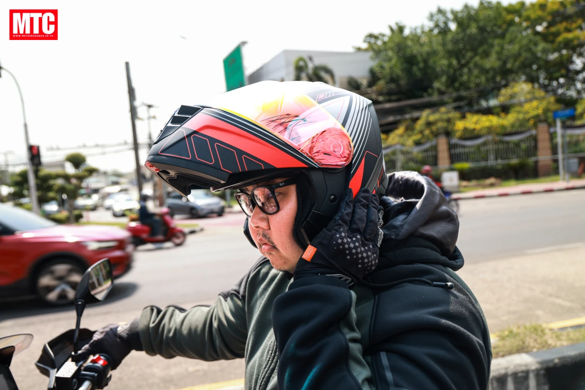 สัมผัสแรกตอนสวมลงศีรษะ ด้วยเทคโนโลยี Multi-Density EPS + SIP (โฟมซับแรงกระแทกหลายความหนาแน่น) ทำให้หมวกกระชับแน่นทุกส่วน สัมผัสได้ทันทีถึงความมั่นใจ อีกอย่างที่รู้สึกได้คือความใสของชิลด์หน้าปรอทแดง ซึ่งมีเทคโนโลยี Optical Class 1 ทำให้มองเห็นได้ชัดเจน ไม่หลอกตา ภายนอกดูสวย แต่ไม่บิดเบือนภาพ ภายในมองออกไปเคลียร์มาก อันนี้ดีจริง ๆ