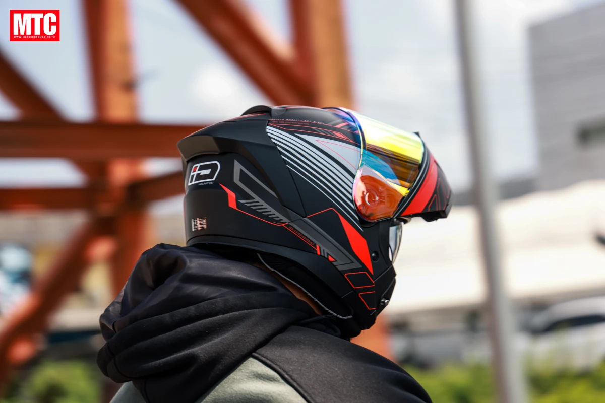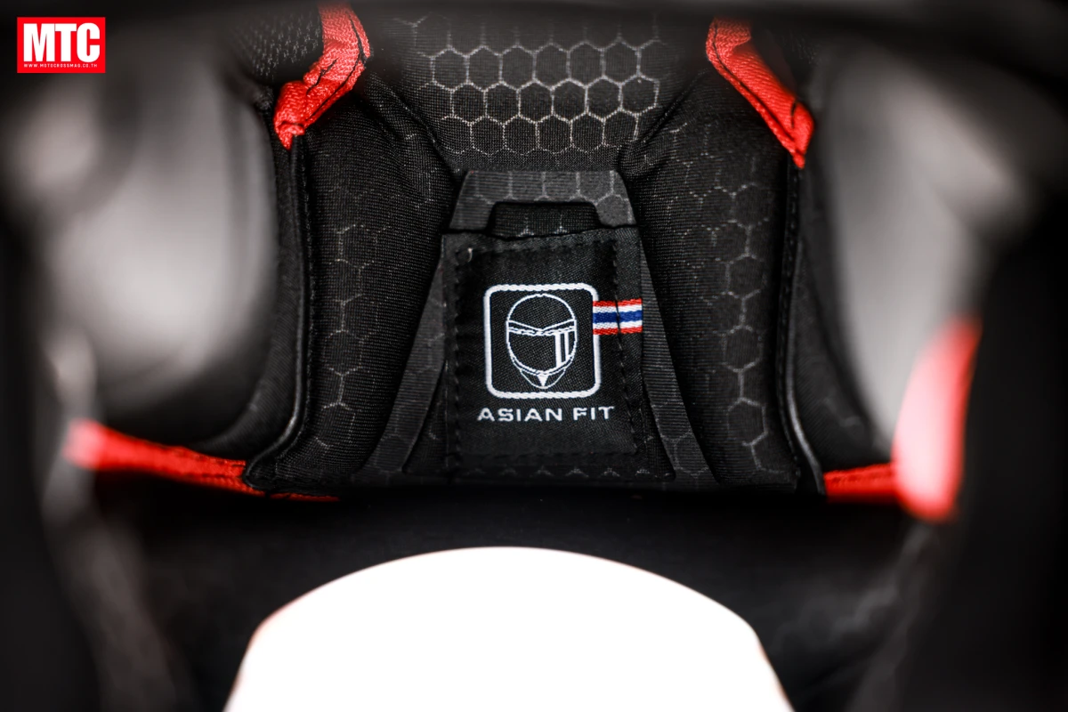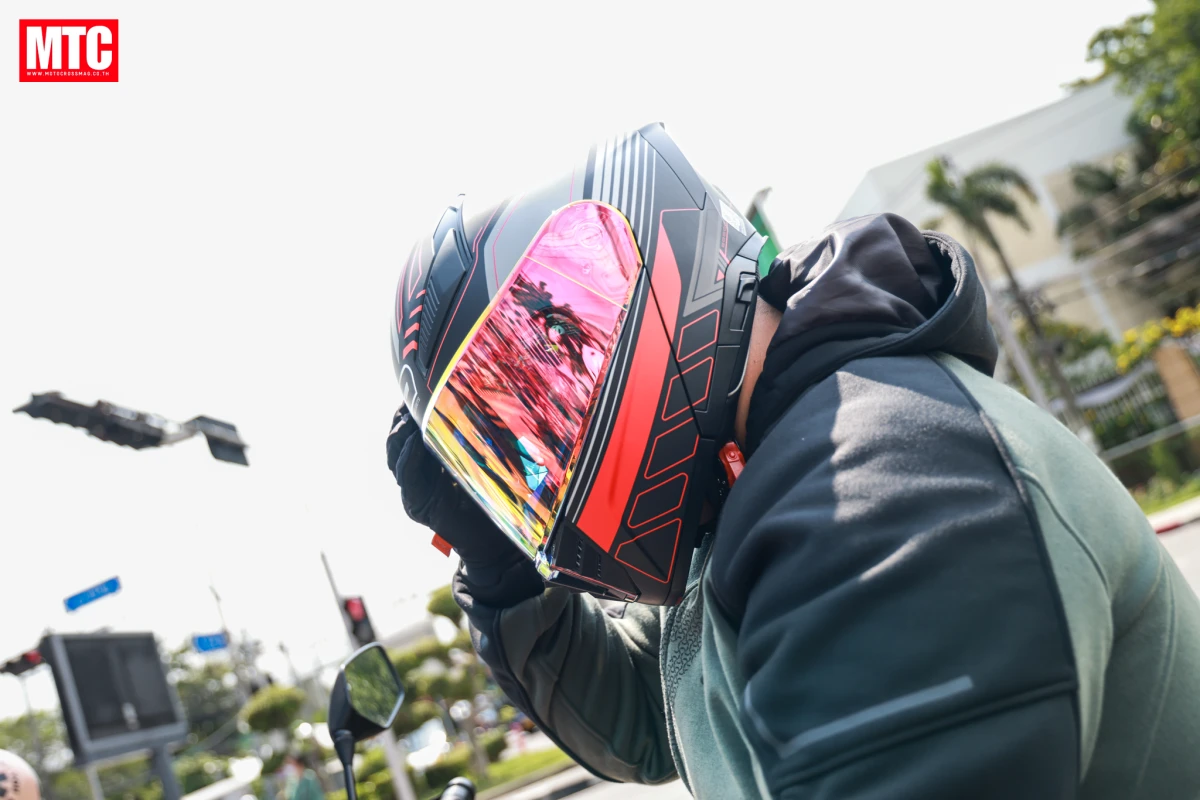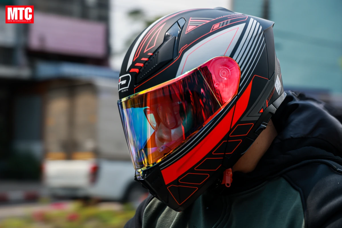 สัมผัสแรกตอนสวมลงศีรษะ ด้วยเทคโนโลยี Multi-Density EPS + SIP (โฟมซับแรงกระแทกหลายความหนาแน่น) ทำให้หมวกกระชับแน่นทุกส่วน สัมผัสได้ทันทีถึงความมั่นใจ อีกอย่างที่รู้สึกได้คือความใสของชิลด์หน้าปรอทแดง ซึ่งมีเทคโนโลยี Optical Class 1 ทำให้มองเห็นได้ชัดเจน ไม่หลอกตา ภายนอกดูสวย แต่ไม่บิดเบือนภาพ ภายในมองออกไปเคลียร์มาก อันนี้ดีจริง ๆ