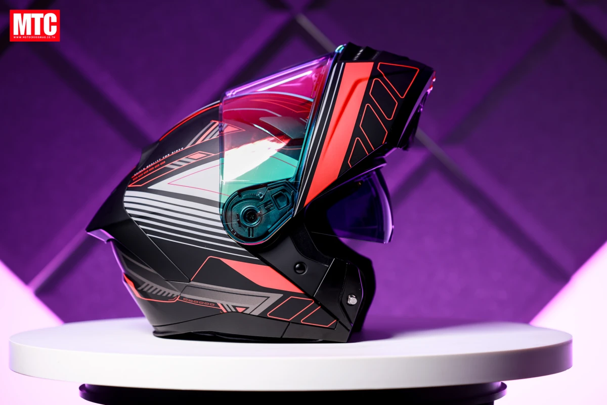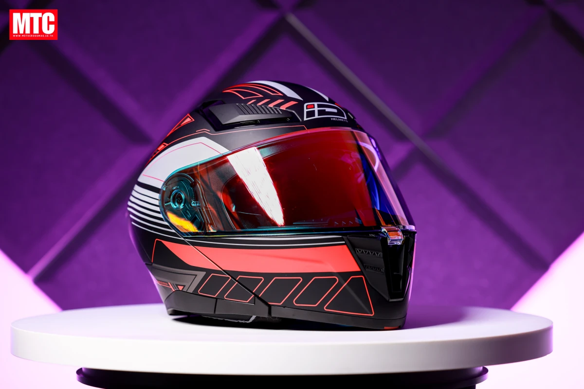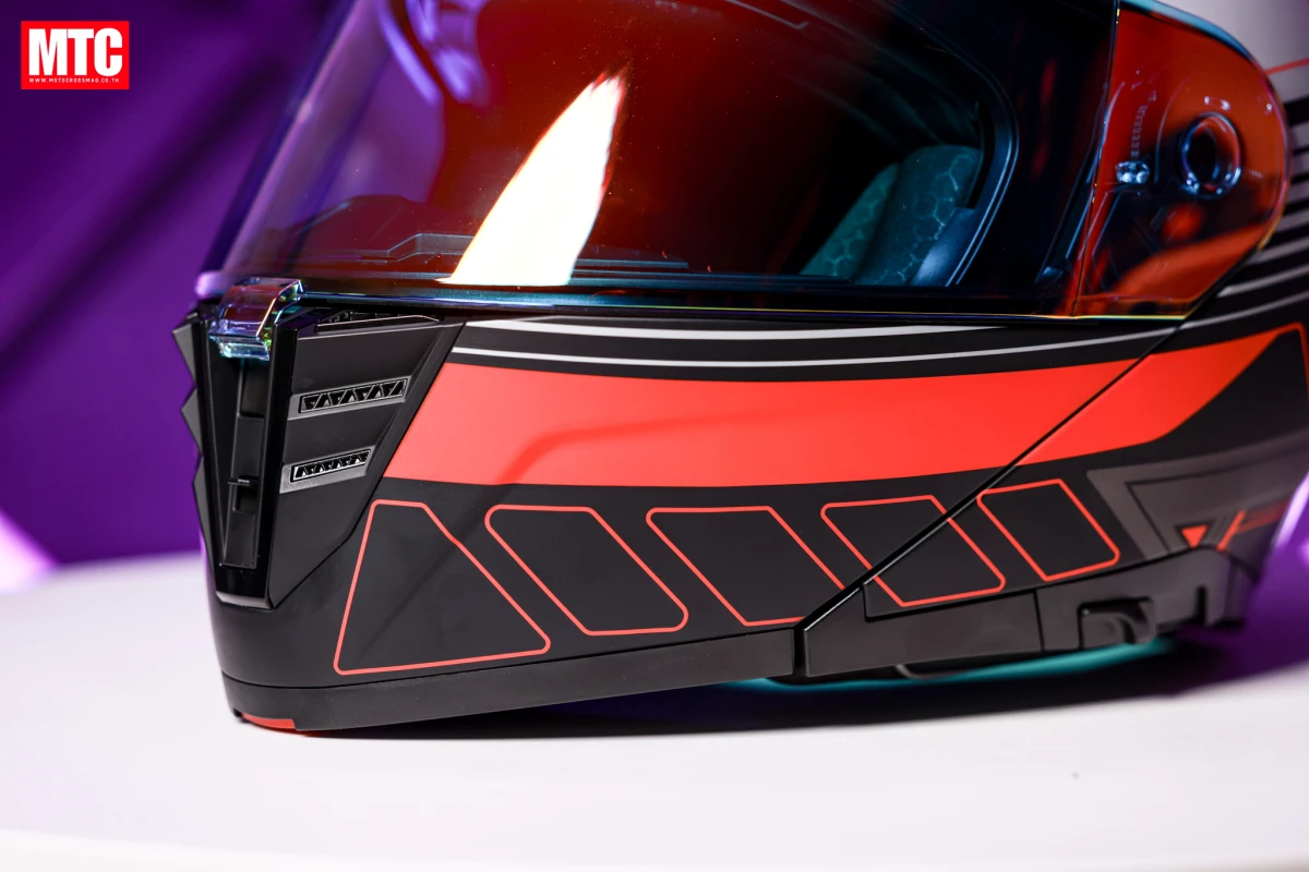 ระบบ Flip up มีกลไกระบบล็อคส่วนคางหมวก พร้อมสวิตช์ปลดล็อคยกเปิดคางได้ง่าย