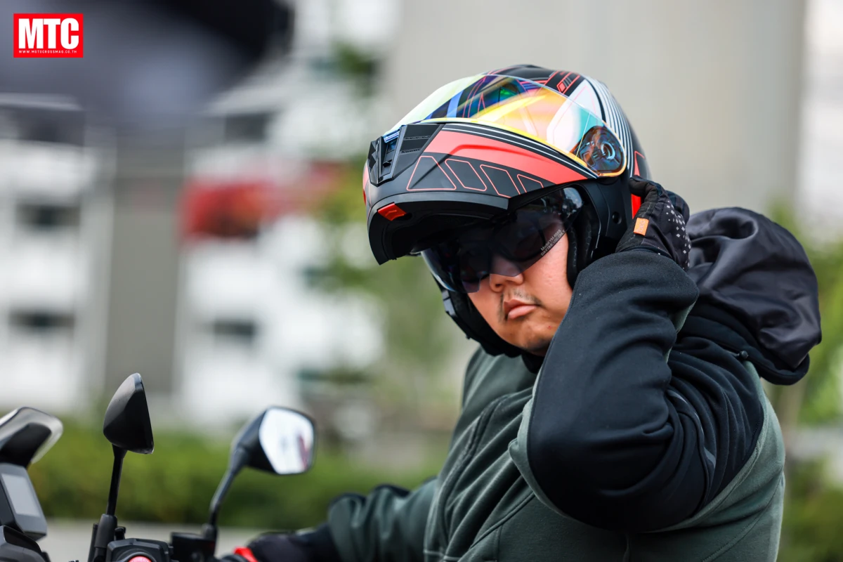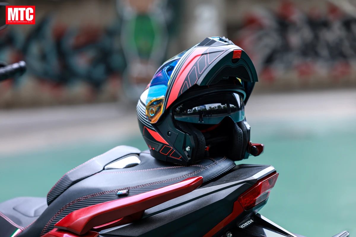 จากการลองขับขี่กับรถสกู๊ตเตอร์ 350 ซีซี อย่าง ADV350 ส่วนตัวมองว่าหมวกยกคางใบนี้โอเคเลย ถึงจะมีน้ำหนักประมาณ 1,800 กรัม แต่ถ้าเลือกไซส์ที่พอดีจะรู้สึกไม่หนักคอมากนัก ฟังก์ชันการใช้งานขณะขับขี่ ทั้งการยกคาง การเปิดแว่นกันแดด หรือการปรับกลไกเปิด-ปิดรูระบายอากาศ สามารถทำได้ง่ายด้วยมือซ้ายเพียงข้างเดียว แรก ๆ อาจจะยังไม่ชินมือ แต่พอขี่ไปสักพักจนรู้จังหวะรู้ตำแหน่งก็ทำได้คล่อง
