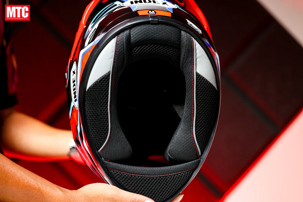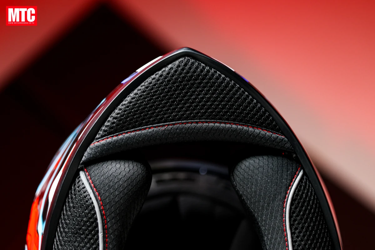 สัมผัสแรกเลยที่รู้สึกได้คือ ตัวหมวกมีความกระชับศีรษะ เกิดจากการออกแบบโฟมและนวมหมวกด้านในที่ทำออกมาได้ดี เวลาขับขี่ในช่วงความเร็วสูง ๆ มีลมมาปะทะก็ไม่ทำให้หมวกส่าย