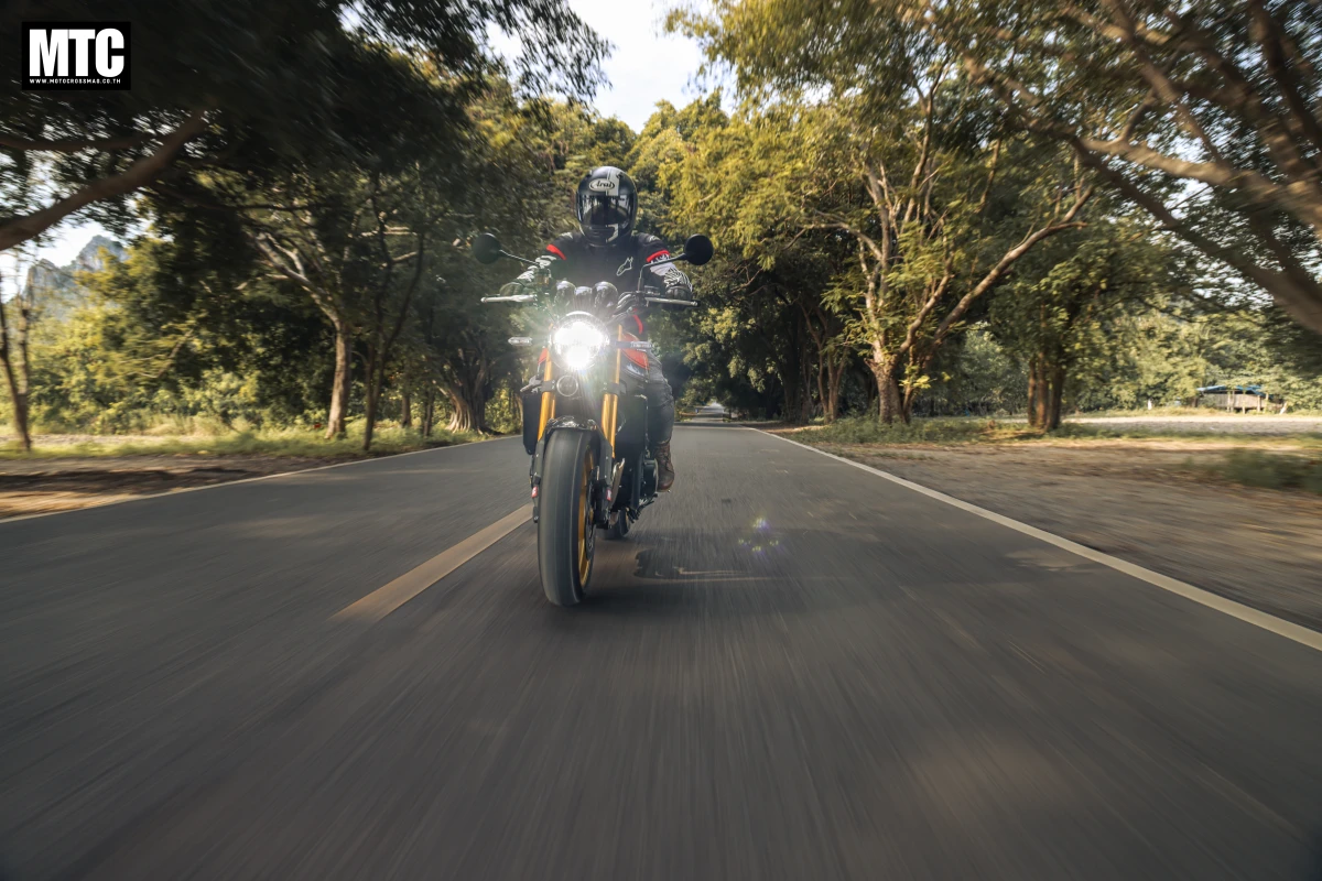ต้นเหตุคือโช้คหน้าหัวกลับแกน 41 มม. กับค่าเซ็ทติ้งตากโรงงาน ที่บาลานซ์ดีจัด ๆ ขณะเดียวกันก็ยังให้ขอบเขตการปรับค่ามาได้น่าสนใจมากๆด้วย สามารถปรับความหนืดของโช้คอัพได้ทั้งแบบยุบตัว (12 ระดับ) และแบบคืนตัว (10 ระดับ) รวมถึงปรับพรีโหลดแบบไม่มีสเต็ป ซึ่งแบบนี้หมายถึงถ้าเราอยากเซ็ตค่าโช้คหน้าเอาไว้ให้เหมาะกับสไตล์การขี่ของตัวเอง ก็จะทำได้อย่างง่ายดายและแม่นยำ