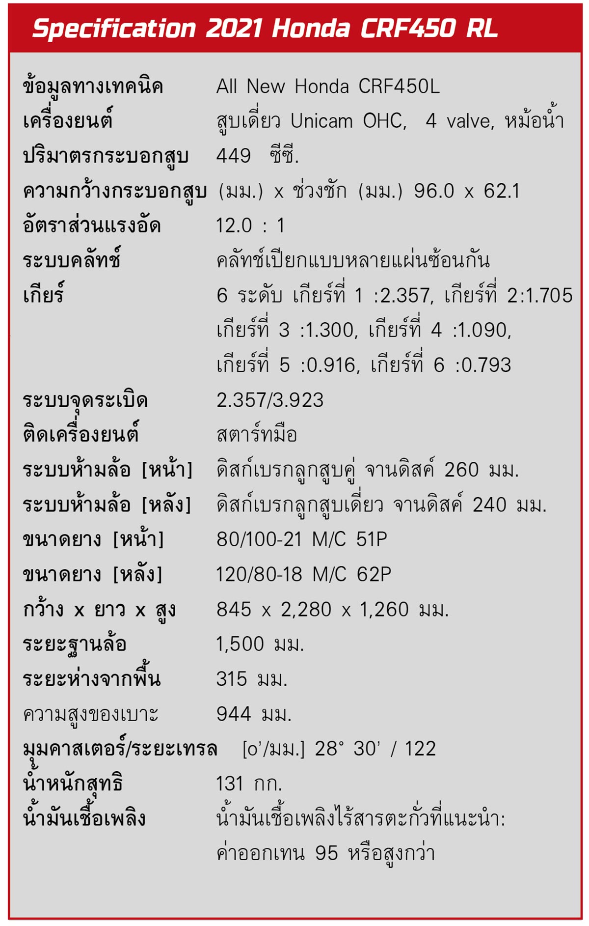 เกิดเป็นกระแสถกเถียง หน้าดำคร่ำเครียดกันในวงกว้าง ทันทีที่ Honda เปิดตัวจำหน่าย All New CRF450RL ดูอัลเพอร์โพส คลาส 450 ซีซี.ในตระกูล CRF-RL ซึ่งหมายถึงการเป็นรถวิบากที่สามารถ “จดทะเบียนได้” ถูกต้องตามกฏหมาย และแอบแซ่บ!!ด้วยขุมพลังที่เกิดจาก DNA เดียวกับ “รถสูตร” ตระกูลCRF450Rซึ่งคว้าแชมป์สายเดิร์ทมามากมาย (แต่ใน CRF450RLมีการลดทอนกำลังลงมาเพื่อความเหมาะให้ออกมาวิ่งถนนได้)