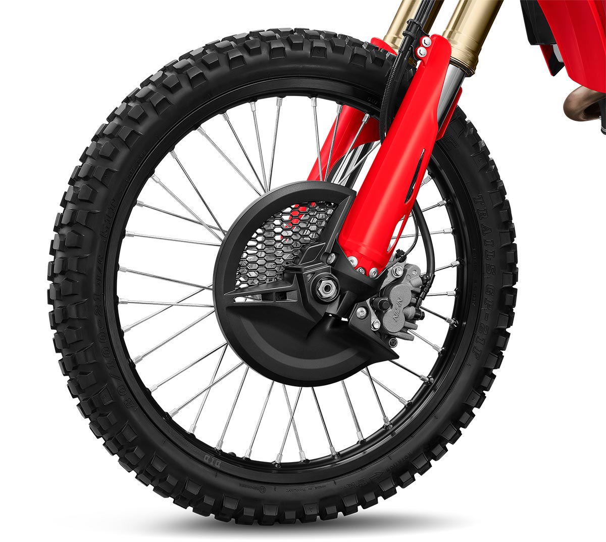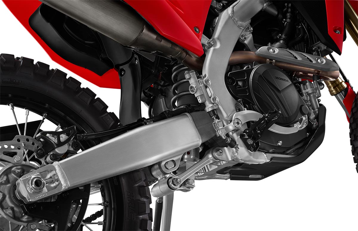 ระบบกันสะเทือนหลังโช้คอัพเดี่ยว ทำงานร่วมกับสวิงอาร์มและแขนกระเดื่อง โปร-ลิงค์ ล่างระดับตัวแข่งโมโตครอส
