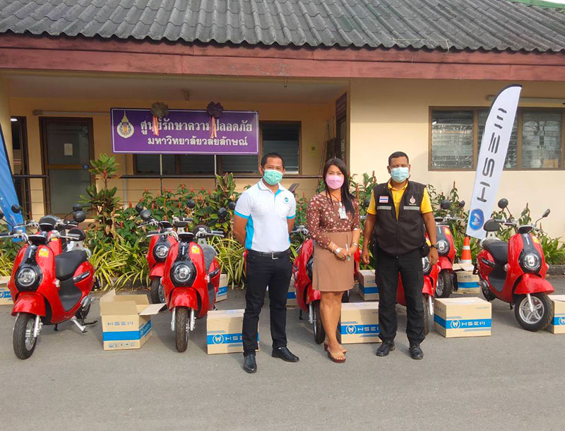 จากภาพ ทีมงาน บริษัท เอช เซม มอเตอร์ จำกัด นำส่งรถมอเตอร์ไซค์ไฟฟ้า เอช เซม รุ่น CIAO จำนวน 10 คัน ให้แก่ศูนย์รักษาความปลอดภัยของมหาวิทยาลัยวลัยลักษณ์ จังหวัดนครศรีธรรมราช เพื่อใช้ในการปฏิบัติงานของหน่วยรักษาความปลอดภัย ตามนโยบายการใช้มอเตอร์ไซค์ไฟฟ้าทดแทนมอเตอร์ไซค์เครื่องยนต์ เพื่อความเป็นมหาวิทยาลัยสีเขียว อีกทั้งประหยัดค่าใช้จ่ายด้านเชื้อเพลิง การบำรุงรักษา และช่วยลดการสร้างมลพิษให้กับสิ่งแวดล้อมไปพร้อมๆ กัน เมื่อวันศุกร์ที่ 11 กุมภาพันธ์ที่ผ่านมา