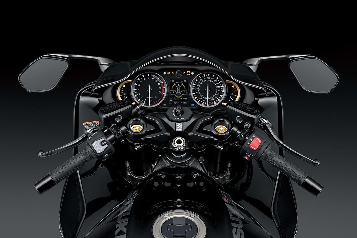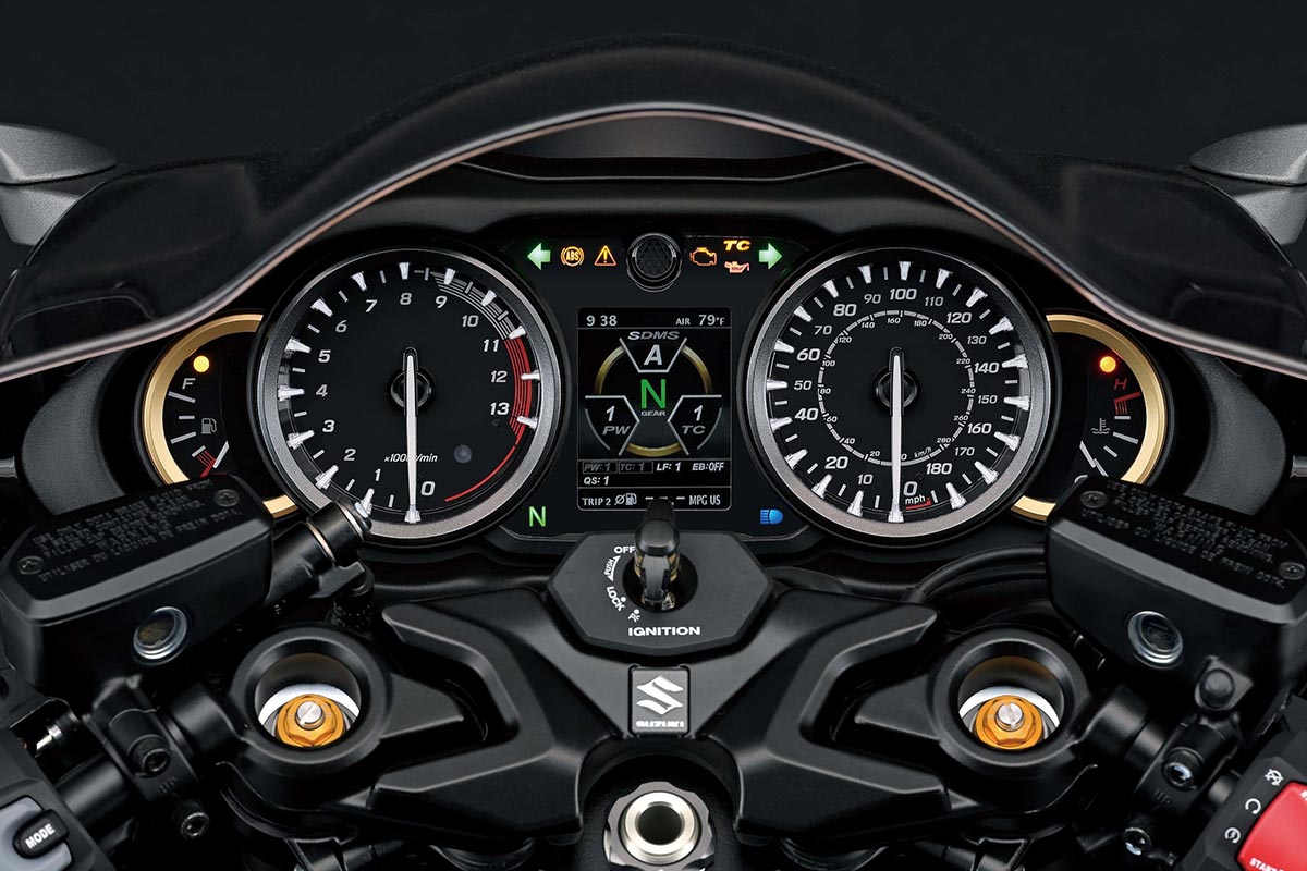 หน้าปัดใหม่.. ก็ไม่เชิง เพราะเกจเรือนไมล์กลมๆ 4 อันของ Hayabusaเป็นอีกสิ่งที่หลายคนหลงใหล ดังนั้น All New 2021Suzuki Hayabusaยังคงรักษาภาพเดิมเอาไว้ เพิ่มเติมหน้าจอ Digital TFT ตรงกลางเพื่อแสดงผลข้อมูลทั้ง Power Mode, TC Setting, ตำแหน่งเกียร์, ระยะทริป, องศาการเอียงรถ และข้อมูลมาตรฐานอื่นๆ (ระยะทางรวม อุณหภูมิภายนอก อัตราสิ้นเปลืองน้ำมัน ฯลฯ) รวมถึงตั้งค่าระบบไฟฟ้าต่างๆตามที่ได้กล่าวข้างต้น