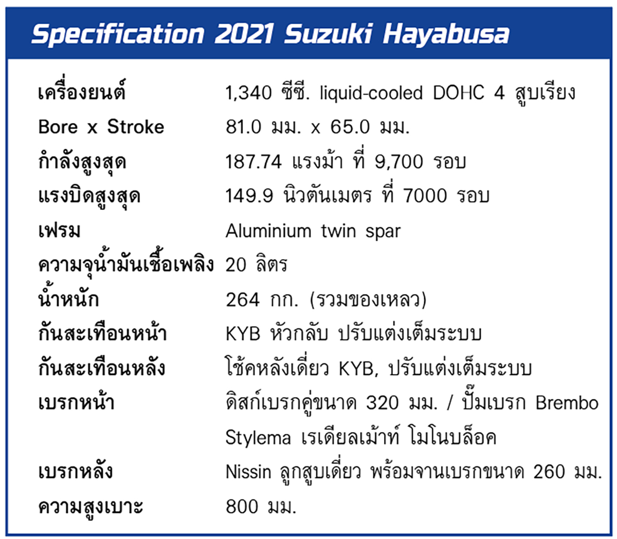 หลายๆคนที่อ่านมาถึงตรงนี้น่าจะเริ่มเอะใจแล้วล่ะ “เอ๊ะ ปรับใหม่เกือบหมดเลยนี่หว่า?” ใช่ครับ.. ซึ่งส่วนตัวผมก็ถือว่ามันค่อนข้างเข้าท่าอยู่นะ เพราะคนที่เลือกขับขี่ Hayabusaจริงๆก็คงต้องการ “ความเป็น Hayabusa” ให้มากที่สุด จะมาอัพเดตใหม่ผอมเพรียวไปเลยก็คงจะผิดใจกับแฟนๆที่ชื่นชอบซูซูกิมานานเสียมากกว่า.. และการจัดฟังก์ชั่นระบบไฟฟ้ามาให้จัดเต็มขนาดนี้ก็ถือว่าเข้ากับยุคสมัยทีเดียว ..แม้จะยังเชื่อมต่ออุปกรณ์สมาร์ทโฟนไม่ได้ก็ตาม….