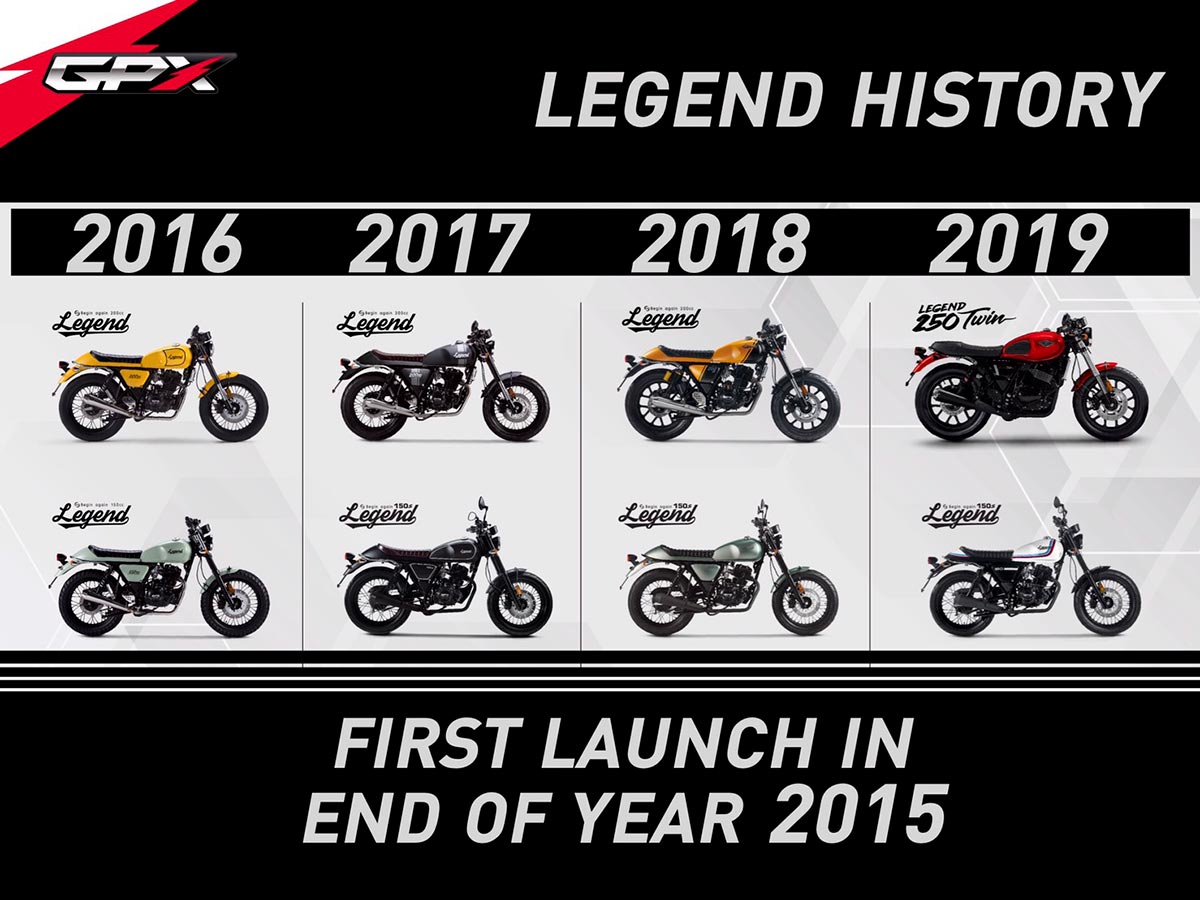 GPX โดยบริษัท จีพี มอเตอร์ (ประเทศไทย) จำกัด ทำตลาดรถสไตล์คลาสสิคภายใต้ชื่อรุ่นตระกูล LEGEND มานานกว่า 4 ปีไล่เรียงมาตั้งแต่เปิดตัวครั้งแรกในงาน MOTOR EXPO 2015