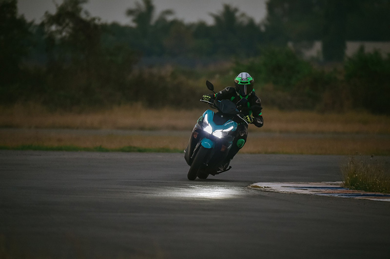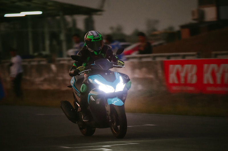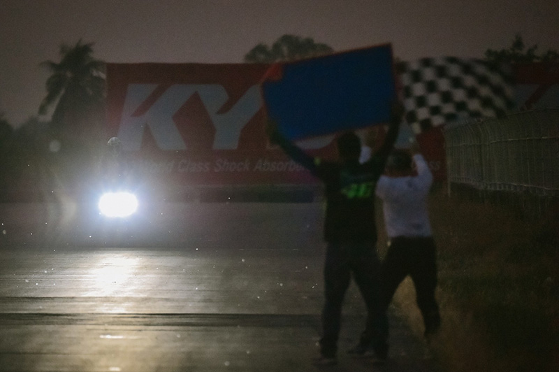 เข้าสู่ช่วงท้ายของการทดสอบ พระอาทิตย์เริ่มตกดิน ระบบไฟส่องสว่างทำงานอย่างเห็นได้ชัด ถือว่าเป็นอีกหนึ่งความสวยงามที่เราได้เห็น เพราะน้อยครั้ง จะได้เห็นรถเปิดไฟหน้าในสนามแข่ง ในช่วงพระอาทิตย์ตกดิน หลังจากธงตาหมากรุกโบกสะบัด ระยะทางที่เราทำได้คือ 569 กิโลเมตร ส่วนน้ำมันเชื้อเพลิงที่สามารถจุได้ 5.5 ลิตร เราเติมไป 3 ถัง กับอีก 2 ลิตร ก็ถือว่ายังประหยัด แม้ว่ารอบเครื่องจะถูกกระชากขึ้นลงตามสไตล์การขับขี่ในสนามแข่งก็ตาม สภาพยางก็ยังสามารถนำไปใช้งานต่อได้อีก ไม่เป็นคลื่น คือสิ่งที่ส่งผลมาจากระบบกันสะเทือนที่ดี