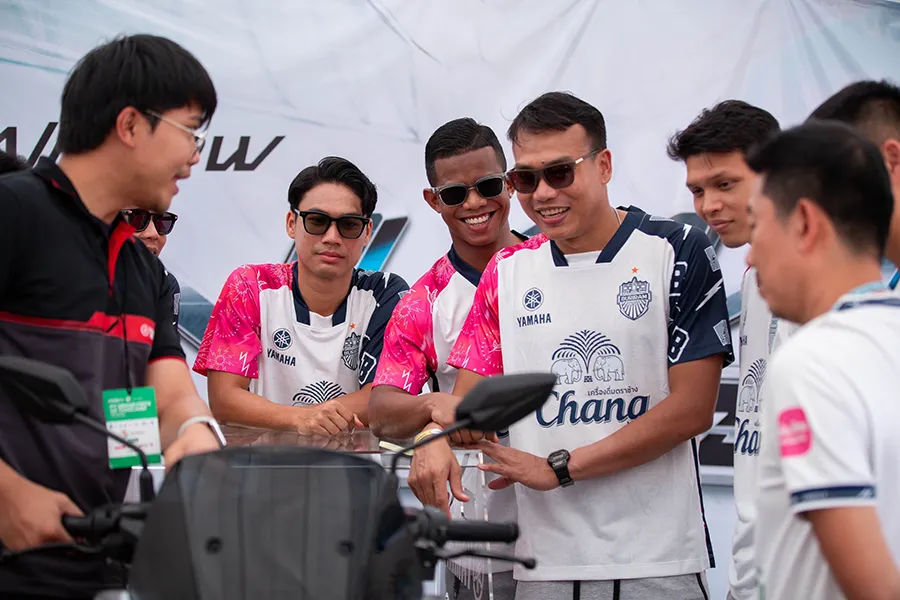 นางสาววรดี วรพงศ์ ผู้จัดการกลุ่มงานสื่อสารการตลาด ให้การต้อนรับ นายชนน์ชนก ชิดชอบ พร้อมทัพแข้งปราสาทสายฟ้า บุรีรัมย์ ยูไนเต็ด นำโดย กัปตันทีม ต้น นฤบดินทร์ วีรวัฒโนดม กองหน้าตัวทีเด็ด อาร์ม ศุภชัย ใจเด็ด ศศลักษณ์ ไหประโคน กองหลังตัวเก่ง พร้อมทัพแข้งปราสาทสายฟ้า ในการร่วมสัมผัสประสบการณ์ มันส์…เปลี่ยนโลก ทดสอบขับขี่ All New YAMAHA NMAX Tech MAX ที่ลานทดสอบขับขี่ บริเวณ Yamaha Rev Venue