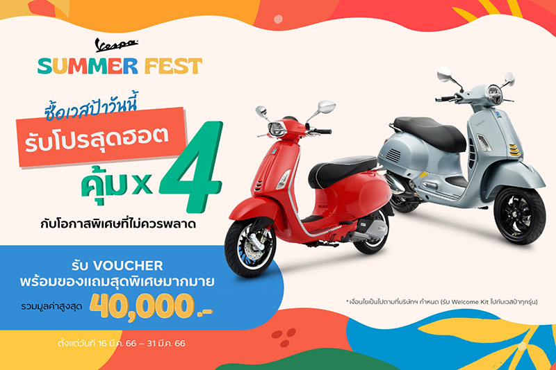 เวสป้า ส่งดีลฮอต รับซัมเมอร์ “Vespa Summer Fest” รับความคุ้ม 4 ต่อ พร้อมของสมนาคุณพิเศษ สูงสุด 40,000บาท