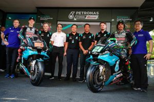 คู่หูนักบิด สังกัดปิโตรนาส ยามาฮ่า เอสอาร์ที แท็กทีมเปิดผ้าคลุมรถแข่ง ยามาฮ่า YZR-M1