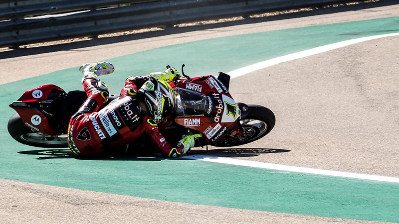 อย่างไรก็ดี ดูคาติก็ไม่ได้เดือดร้อนอะไรนัก เนื่องจากเจ้าของตำแหน่ง P1 ประจำวันเสาร์ยังคงเป็นรถในพิทของตัวเอง #21 Michael Ruben Rinaldi (Aruba.it Racing – Ducati) ออกตัวได้ไม่ดีนัก ย่องตาม Razgatlioglu และ #65 Jonathan Rea (Kawasaki Racing Team WorldSBK) ที่สู้กันอยู่ด้านหน้า ก่อนที่ไม่นาน Bautista จะล้มออกไปจากตำแหน่งจ่าฝูงสู่ท้ายแถว