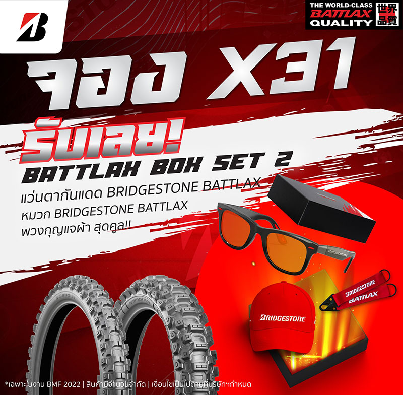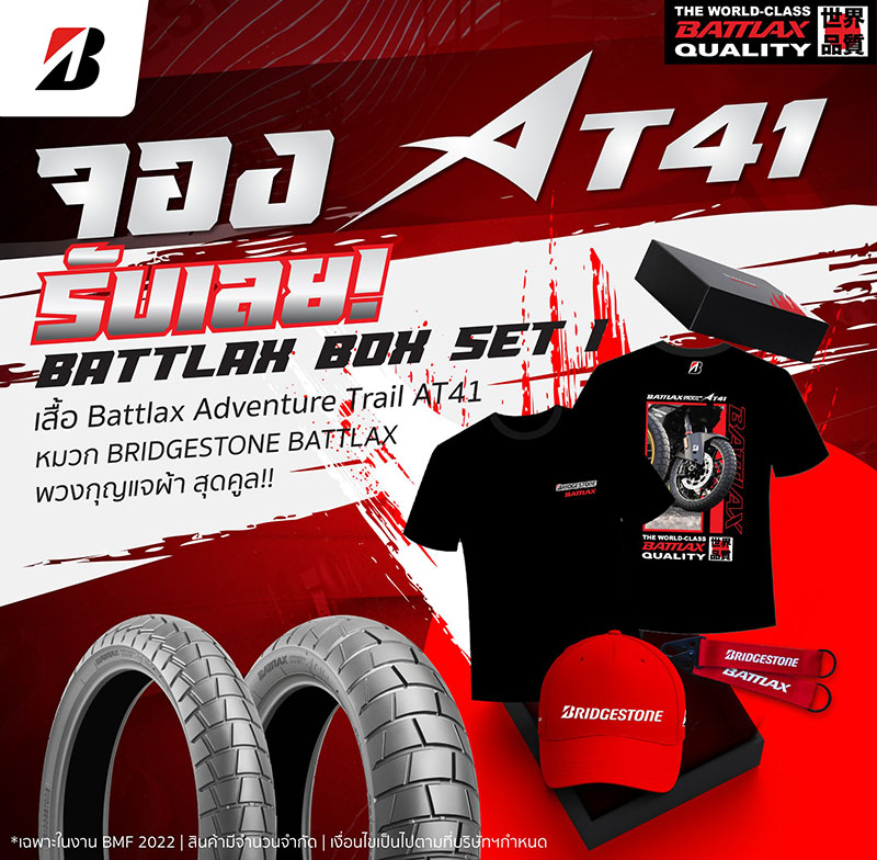 พร้อมมอบโปรสุดฮอตโดนใจสำหรับผู้ที่จองภายในงานนี้ โดยผู้จองยางรุ่น AT41 จะได้รับ BATTLAX BOX SET 1 ของพรีเมี่ยมที่ประกอบไปด้วย เสื้อ Battlax Adventure Trail AT41 และ หมวก Bridgestone Battlax และพวงกุญแจผ้าสุดคูล ส่วนผู้จองยางรุ่น X31 BATTLAX BOX SET 2 ของพรีเมี่ยมที่ประกอบไปด้วย แว่นกันแดด,หมวกและพวงกุญแจ Bridgestone Battlax