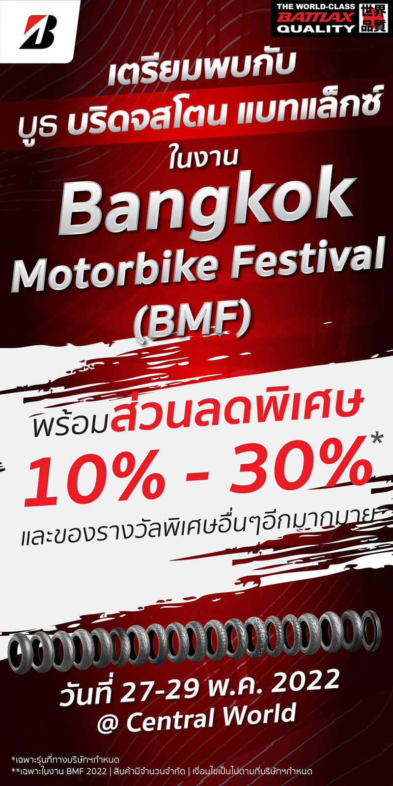 บริดจสโตน โมโตไทยแลนด์ จัดเต็มความยิ่งใหญ่ ยักทัพยางมาตรฐานระดับโลก ครบทุกเซ็กเม้นท์ เอาใจไบค์เกอร์ในเทศกาลคนรักมอเตอร์ไซค์ที่ใหญ่ที่สุดในเอเชียตะวันออกเฉียงใต้ “Bangkok Motorbike Festival 2022” มอบส่วนลด 10-30 % พร้อมของรางวัลพิเศษมากมาย