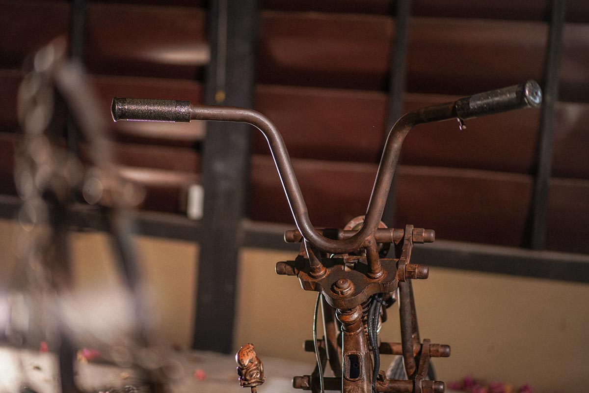 ที่นั่งแบบ “King&Queen” ทำจากหนังถูกตัดเย็บเป็นลาย “ข้าวหลามตัด” ที่สอดแทรกด้วยหมุดลายสมอเรือ เบาะเป็นงาน “Handmade” ทั้งใบ ไฟหน้าคู่สุดวินเทจ ปลายแจกันคู่ แบบออก 1 ทางแต่มีปลายท่อถึง 2 ท่อ ขาตั้งถูกสร้างขึ้นใหม่ ส่วนสีนั้นไม่ต้องพูดถึง มันเกิดจากสนิมที่เกิดขึ้นจริงตามธรรมชาติ !! ซึ่งให้สีออกน้ำตาลอมแดง ให้กลิ่นอายความเป็น Rat Bike สิ่งที่สะดุดตาอีกอย่างคงหนีไม่พ้น กรองน้ำมัน ซึ่งเป็นกรองน้ำมันแบบโบราณ วัสดุทำจากแก้ว ซึ่งทำให้รถคันนี้ดูคลาสสิคมากขึ้นไปอีก