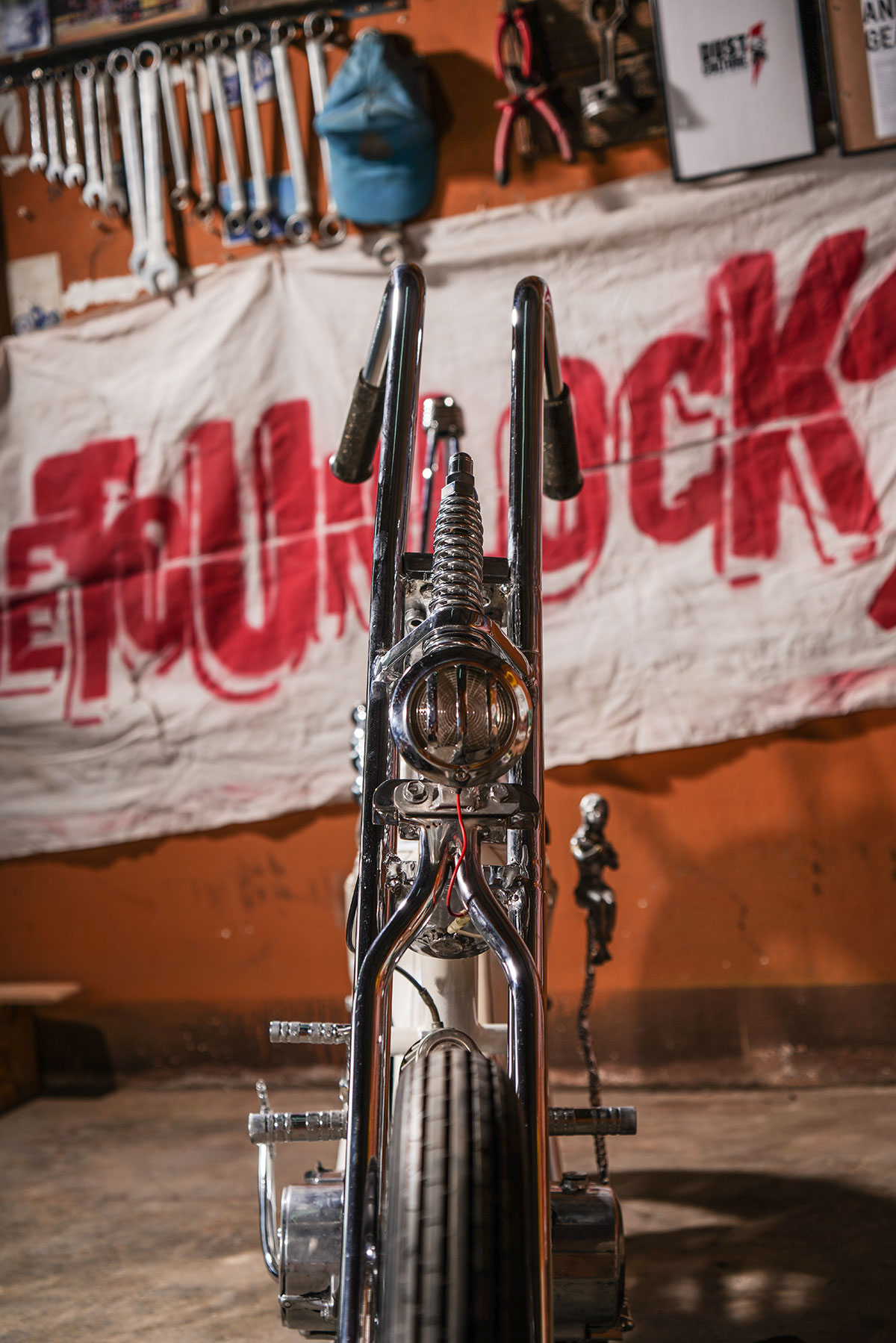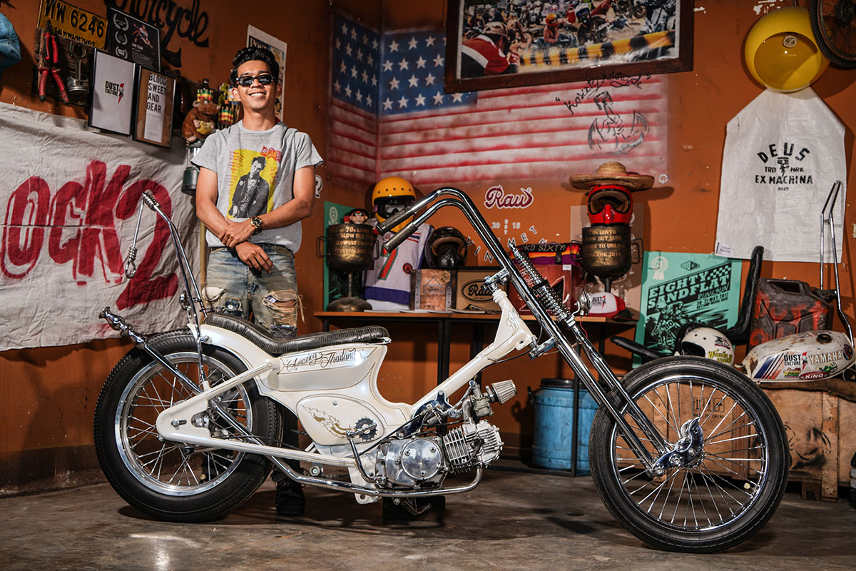 เดิมทีรถคันนี้คือ “Honda C70” เริ่มการผลิตขึ้นในปี 1967 เป็นรถจักรยานยนต์ที่ได้ชื่อว่าเป็นรถที่ประสิทธิภาพที่ดี คุ้มค่า และเป็นรถ ขายดียอดนิยมในญี่ปุ่นอีกด้วย ถูกนำมาปรับโฉมใหม่ทั้งหมด ให้ออกมาเป็นรถ “Chopper Old School” ในแบบรถเล็ก! โดยการตัดเฟรมด้านหลัง และสร้างขึ้นใหม่ กลายเป็นเฟรมแบบ “Hard Tail” หรือที่เรียกกันติดปากว่า “หลังแข็ง” หรือไม่มีโช้คอัพนั่นเอง ตามมาด้วยบังโคลนท้ายที่ถูกสร้างขึ้นใหม่เพื่อรองรับชุดล้อหลังที่ขนาด 17” รัดมาพร้อมกับยางไซส์ 4.00 ด้านหน้าถูกแทนที่ด้วยชุดหน้าแบบสปริงเกอร์ชิ้นเดียว ที่ต่อยาวมาจนเป็นแฮนด์บาร์ มาพร้อมล้อหน้าขนาด 18 นิ้ว รัดด้วยยางลายตรงสุดคลาสสิคไซส์ 2.75 ไฟหน้าขนาด 3 นิ้ว คันเร่งแบบซ่อนสายเพิ่มความเนียนตา