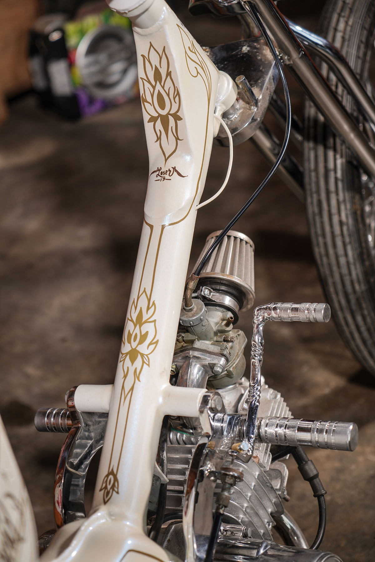 ชุดเบาะ Cobra Seat ตัดเย็บด้วยความปราณีตจากร้านเบาะที่กำลังร้อนแรงสุดๆในเวลานี้ของเมืองไทย “Ya Seat Custom”…เครื่องยนต์ ถูกยกมาจาก Honda Wave พร้อมเกียร์แบบ Hand Shift ที่มีหัวเกียร์งานสร้างเป็นรูป “มักรีผล” ตามด้วยชุดพักเท้าถูกยกขึ้นสูง ในส่วนของ Sissy Bar ด้านหลังรูปเชือกผูกคอ ก็เป็นอีกหนึ่งงานสร้างจากทางร้านเช่นกัน รถคันนี้สี “Pearl White” หรือ “ขาวมุก” เพิ่มความสวยงามด้วยลวดลายการเขียน Pinstrip เป็นลายไทย จากสำนัก “Loser Pinstriping”