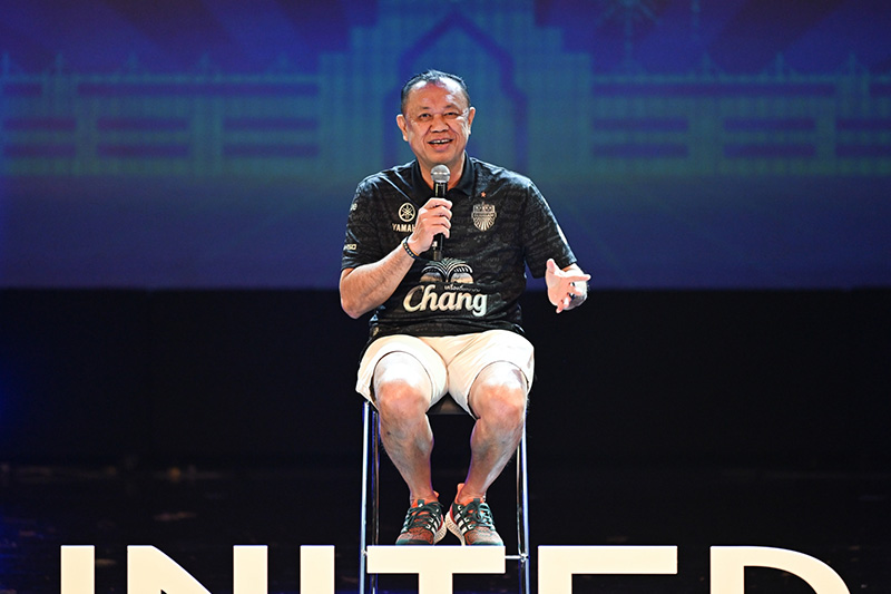 นายภาณุพล กิตติคำรณ รองผู้จัดการใหญ่ด้านการขายและการตลาด บริษัท ไทยยามาฮ่ามอเตอร์ จำกัด ถ่ายภาพร่วมกับนายเนวิน ชิดชอบ ประธานสโมสรฟุตบอล