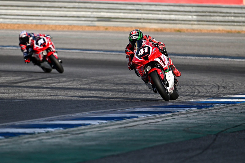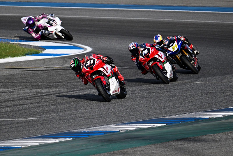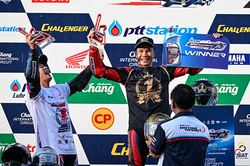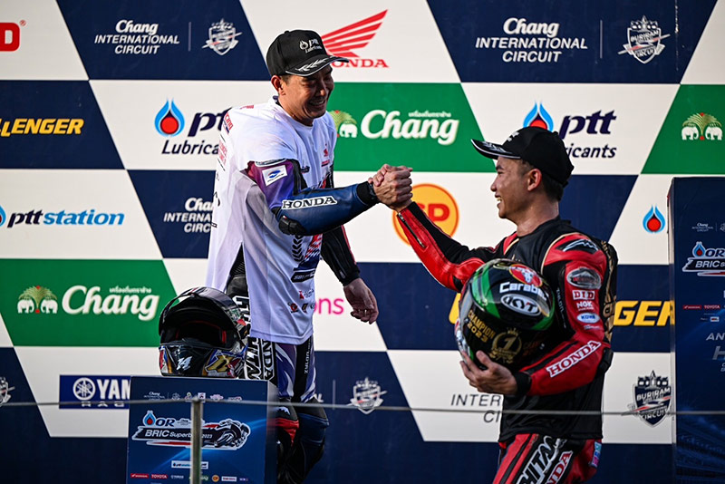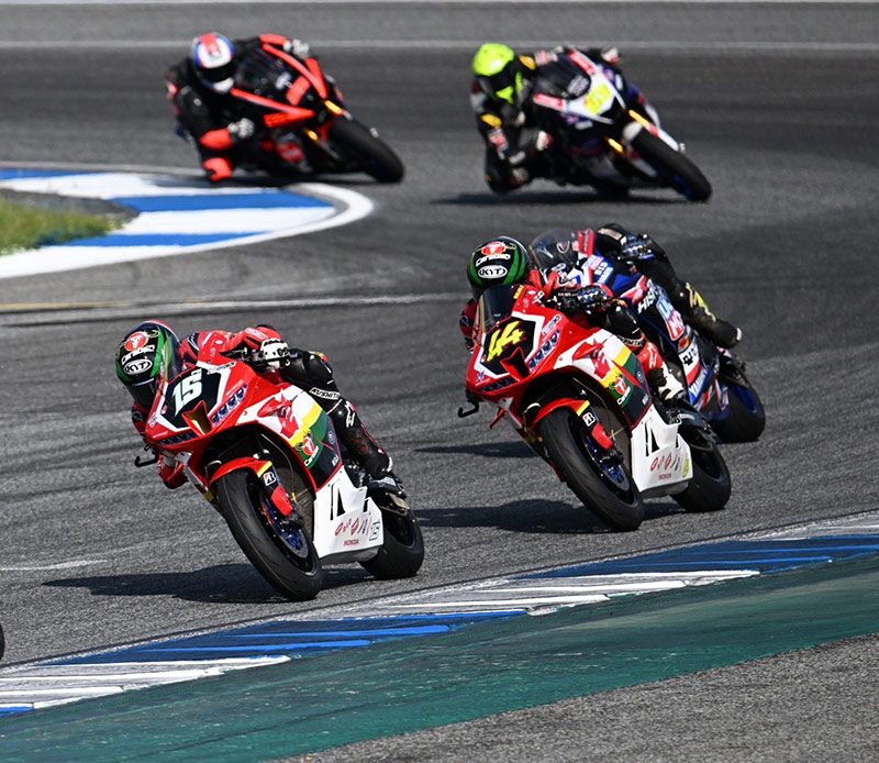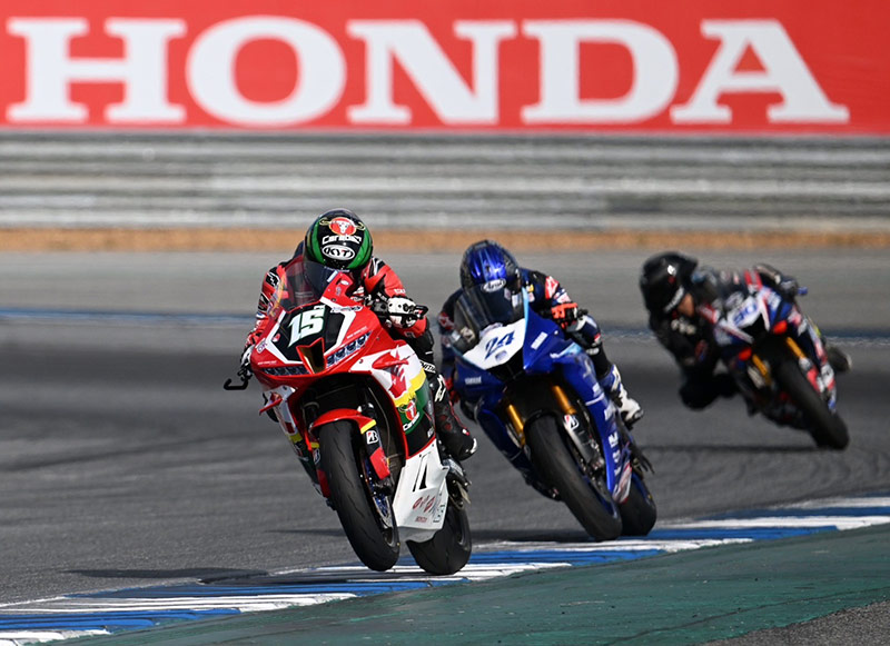 เริ่มเกมรุ่น ซูเปอร์ไบค์ 1000 ซีซี (SB1Pro) “ชิพ-นครินทร์ เจ้าของโพลโพซิชั่น ออกสตาร์ตได้อย่างยอดเยี่ยม ทะยาน Honda CBR1000RR-R หมายเลข 41 ขึ้นนำทันที ตามด้วยทีมเมท “โค้ชฟิล์ม” รัฐภาคย์ วิไลโรจน์ หมายเลข 14 โดยการแข่งขันดำเนินไปพร้อมกับการแสดงความเหนือชั้นของดูโอ้จาก “ฮอนด้า เรซซิ่ง ไทยแลนด์” เริ่มยืดระยะห่างออกจากคู่แข่งเรื่อยๆ ด้วยศักยภาพที่เหนือกว่า ก่อนที่ “ชิพ-นครินทร์” จะยกล้อเข้าเส้นชัยมาเป็นอันดับที่ 1 ตามมาด้วย “โค้ชฟิล์ม” รัฐภาคย์ วิไลโรจน์ ในอันดับที่ 2