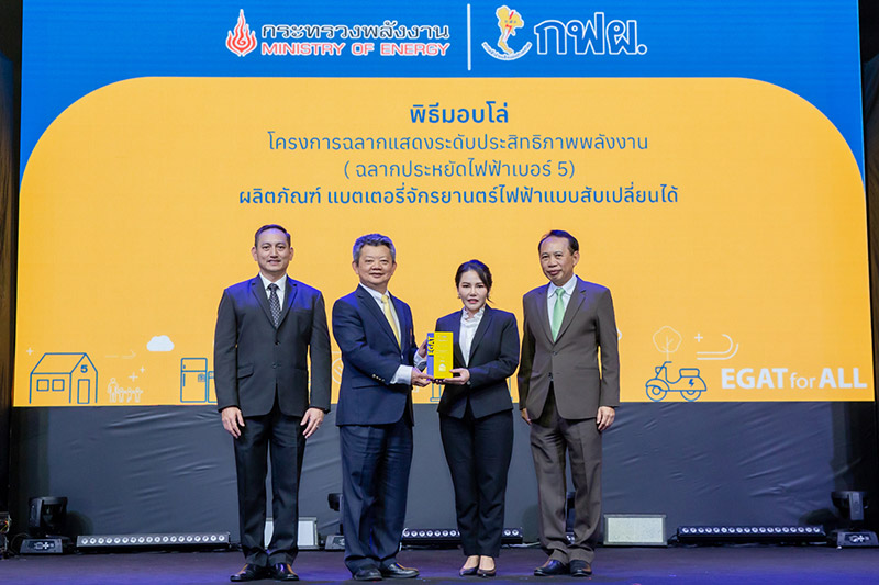 คุญมัญชรี สงเคราะห์ ประธานเจ้าหน้าที่ฝ่ายปฏิบัติการ บริษัท เอช เซม มอเตอร์ จำกัด (ที่ 2 จากขวา) รับโล่โครงการฉลากแสดงระดับประสิทธิภาพพลังงาน (ฉลากประหยัดไฟเบอร์ 5) สำหรับผู้ประกอบการผลิตภัณฑ์ แบตเตอรี่จักรยานยนต์ไฟฟ้าแบบสับเปลี่ยนได้ จากคุณประเสริฐศักดิ์ เชิงชวโน รองผู้ว่าการยุทธศาสตร์ การไฟฟ้าฝ่ายผลิตแห่งประเทศไทย (กฟผ.) (ที่ 2 จากซ้าย) และเป็นการรับโล่ฉลากประหยัดไฟเบอร์ 5 ติดต่อกัน 2 ปีซ้อน เมื่อวันที่ 20 กันยายนที่ผ่านมา ณ อาคาร 9 ศูนย์การประชุมและแสดงสินค้า อิมแพ็ค เมืองทองธานี