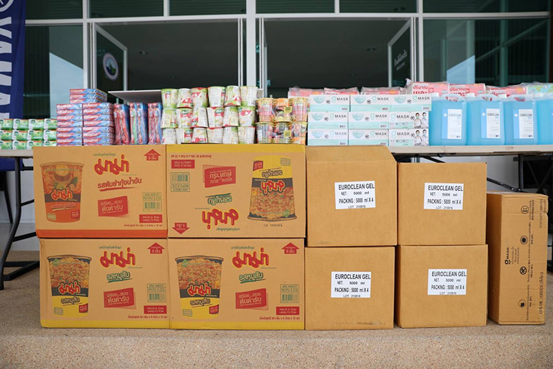 นายสุรชัย เพชรพงษ์ (คนที่ 4 จากขวา) ผู้จัดการทั่วไปฝ่ายธุรการทั่วไป บริษัท ไทยยามาฮ่ามอเตอร์ จำกัด เป็นตัวแทนบริษัทฯ ทำการมอบเครื่องอุปโภคบริโภคพร้อมสิ่งของจำเป็น ให้กับ นายอดุลย์ แก้วโบราณ (คนที่ 4 จากซ้าย) นายกองค์การบริหารส่วนตำบลศีรษะจรเข้ใหญ่ สำหรับการบรรจุลงถุงยังชีพเพื่อมอบต่อให้กับประชาชนที่ติดเชื้อโควิด-19 ที่เข้าพักรักษาตัว ณ ศูนย์พักคอย (Community Isolation) ต.ศีรษะจรเข้ใหญ่ อ.บางเสาธง จ.สมุทรปราการ อันประกอบไปด้วย อาหารแห้ง, หน้ากากอนามัย, แอลกอฮอล์ 75 เปอร์เซ็นต์, สบู่ฆ่าเชื้อและเครื่องอุปโภคบริโภคอื่นๆโดยมีมูลค่ารวมทั้งสิ้น 20,000 บาท