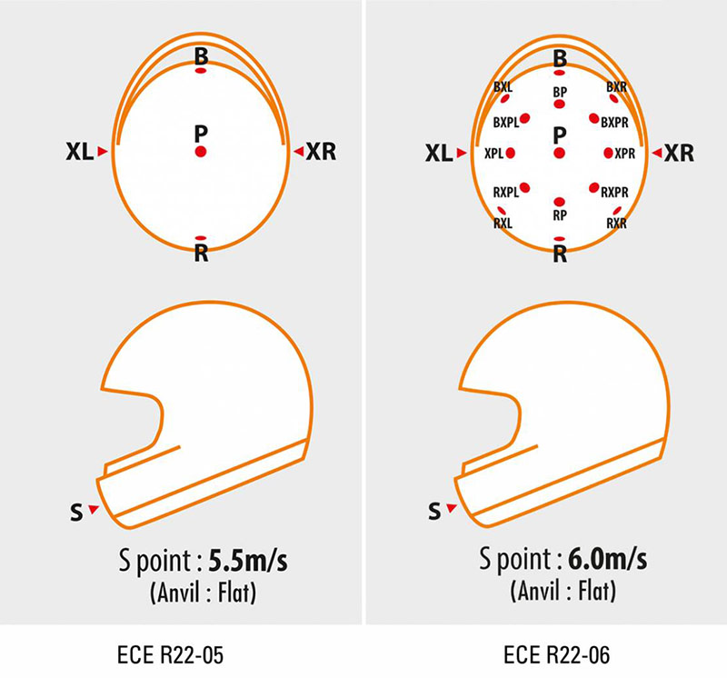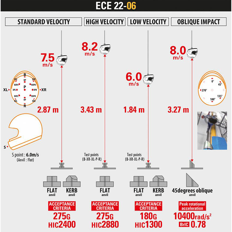 การอัปเดตมาตรฐานความปลอดภัยนี้รวมไปถึงการเพิ่มการทดสอบแรงกระแทกของหมวกที่ละเอียดมากขึ้น.. จากเดิมที่มีการม็อคอัพศีรษะมนุษย์เข้าไปภายในหมวกแล้วไปทดสอบการตกกระทบที่องศาต่างๆตามความเร็วที่ตั้งไว้ โดยอาศัยเซ็นเซอร์ภายในศีรษะม็อคอัพนั้นวัดแรงกระแทกที่แต่ละจุดของหมวกกันน็อก และให้ผลตามตัวเลขที่ออกมาว่าผ่านมาตรฐานหรือไม่เท่านั้น.. แต่การทดสอบของ ECE 22.06 นั้น จะเพิ่มการทดสอบที่ช่วงความเร็วต่างกัน วัดระดับการตกกระทบโดยนำผลที่ได้จากการกระแทกที่มุมต่างๆว่า ส่งผลอะไรต่อสิ่งที่อยู่ภายในหมวกกันน็อกบ้าง รวมถึงการกระแทกแต่ละครั้งนั้นส่งผลต่อจุดอื่นๆของหมวกกันน็อกอย่างไร.. ซึ่งจะทำให้ได้ผลทดสอบที่ใกล้เคียงการใช้งานจริงมากยิ่งขึ้น และยังเพิ่มสถานการณ์การตกกระทบต่างๆเข้าไปอีก เช่น การกระแทกบนพื้นเรียบ, พื้นเอียง หรือพื้นผิวที่มีความโค้งก็ตาม