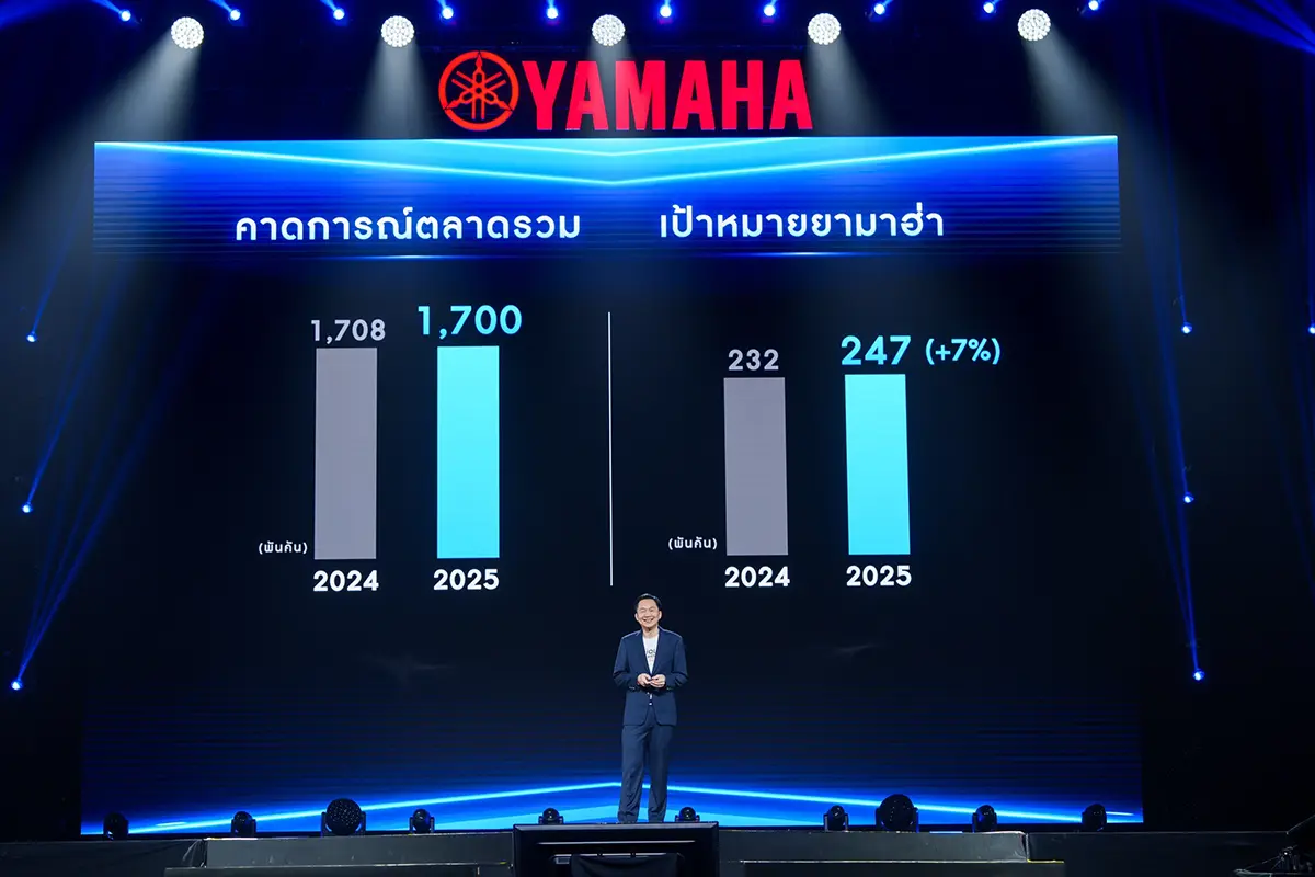 นายพงศธร เอื้อมงคลชัย ประธานกรรมการบริหาร มร.ฮิเดฮิโกะ ทาคากิ รองประธานกรรมการบริหาร นายภาณุพล กิตติคำรณ ผู้จัดการใหญ่ด้านการค้า พร้อมคณะผู้บริหารระดับสูง บริษัท ไทยยามาฮ่ามอเตอร์ จำกัด ถ่ายรูปร่วมกันในงานแถลงนโยบายประจำปี 2568 โดยในปีที่ผ่านมายามาฮ่าได้รับความไว้วางใจจากชาวไทยเป็นอย่างดี โดยในปี 2568 นี้ ยามาฮ่าชูแคมเปญ “FEEL THE UNIQUE EXPERIENCE….สุดทุกทาง…ต่างทุกฟีล” ที่จะเปิดประสบการณ์สุดพิเศษให้กับลูกค้ารถจักรยานยนต์ยามาฮ่าได้สัมผัสกับเทคโนโลยีอันล้ำสมัยของรถจักรยานยนต์ และไลฟ์สไตล์ที่ตอบโจทย์ทุกความต้องการของลูกค้า โดยยามาฮ่าส่ง 5 โมเดลใหม่ เพื่อชิงส่วนแบ่งการตลาดปี 2568 เป็น 14.5%