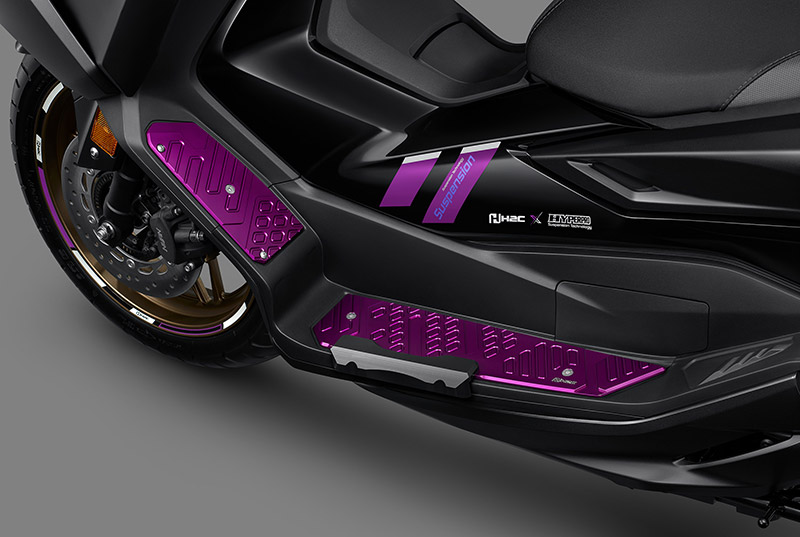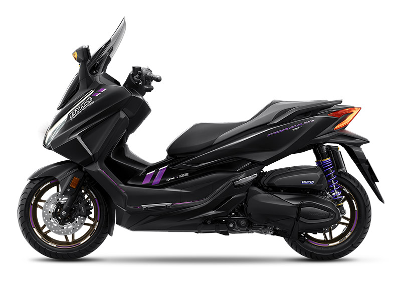 NEW FORZA350 HYPERPRO SPECIAL EDITION ดีไซน์เข้มขั้นสุดด้วยลายเส้นสีม่วงที่เป็นสีเอกลักษณ์ของ HYPERPRO รวมถึงชุดกราฟฟิกที่ออกแบบมาให้ลงตัวตัดกับตัวรถสีดำ เข้าชุดกับแผ่นวางเท้าสีม่วง และวงล้อสีม่วง