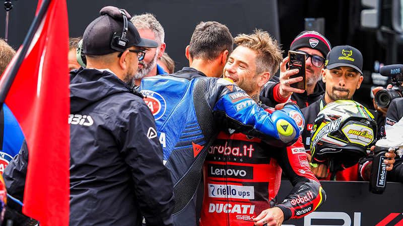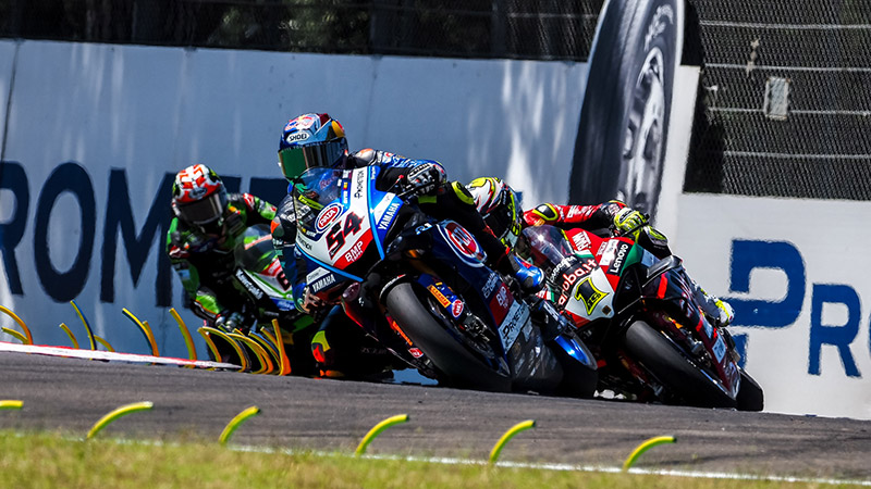 สนามนี้ Alvaro Bautista ยังไม่มีทีท่าจะแผ่วฟอร์มโหดลงไปแม้แต่น้อย นอกเหนือจากการเป็นสนามแข่งเล็กๆที่อาจจะไม่เข้าทางคาแร็คเตอร์ของดูคาติเท่าไร แต่ก็ยังโชว์ทักษะปัดป้องการโจมตีของ 2 อดีตแชมป์โลกทั้ง #54 Toprak Razgatlioglu (Pata Yamaha Prometeon WorldSBK) และ #65 Jonathan Rea (Kawasaki Racing Team WorldSBK) ได้ใน 2 เรซหลัก โดยมีความพยายามใช้แทคติคบู๊เดือดต้นเกมเพื่อชิงจังหวะฉีกห่างจากรถแข่งหมายเลข 1 ให้ได้ แต่ก็ไม่สำเร็จเพราะเมื่อถึงจังหวะเร่งออกโค้ง พี่ Bautista ก็แทบบินข้ามไปในทันที..