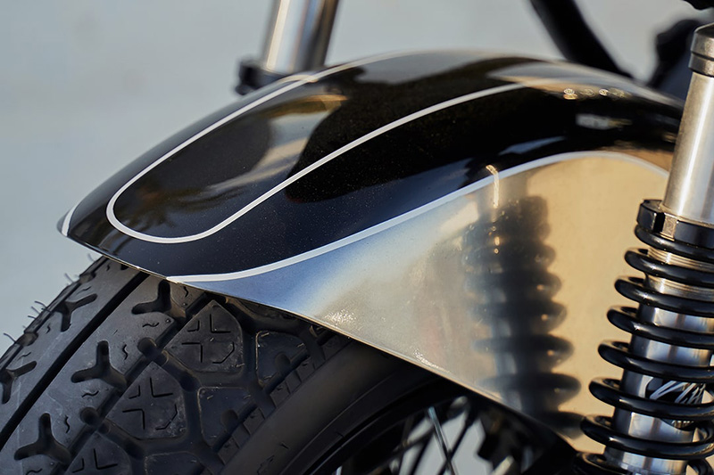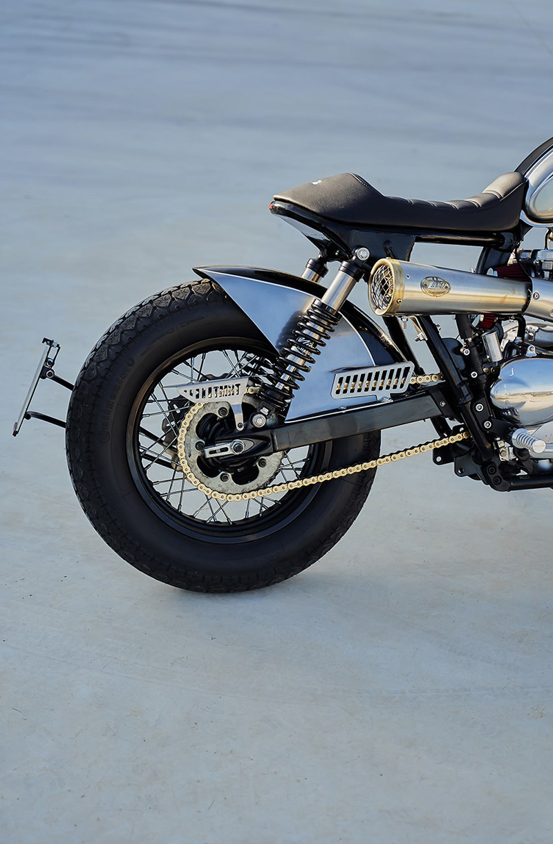 หนึ่งในงานชิ้นแรกๆที่ลงมือคือการ “ยืดสวิงอาร์ม” เพื่อเพิ่มกลิ่นอายของ Dragster และทำให้รูปลักษณ์ของรถดูยาวขึ้น นอกจากนี้ยังเน้นการลงมือไปที่ “บังโคลนหลัง” ทรงแปลกตาและใหญ่มากพอที่จะทำให้หลังของผู้ขับขี่สะอาดสะอ้านหากว่าต้องลุยเส้นทางเฉอะแฉะในวันฝนพรำ