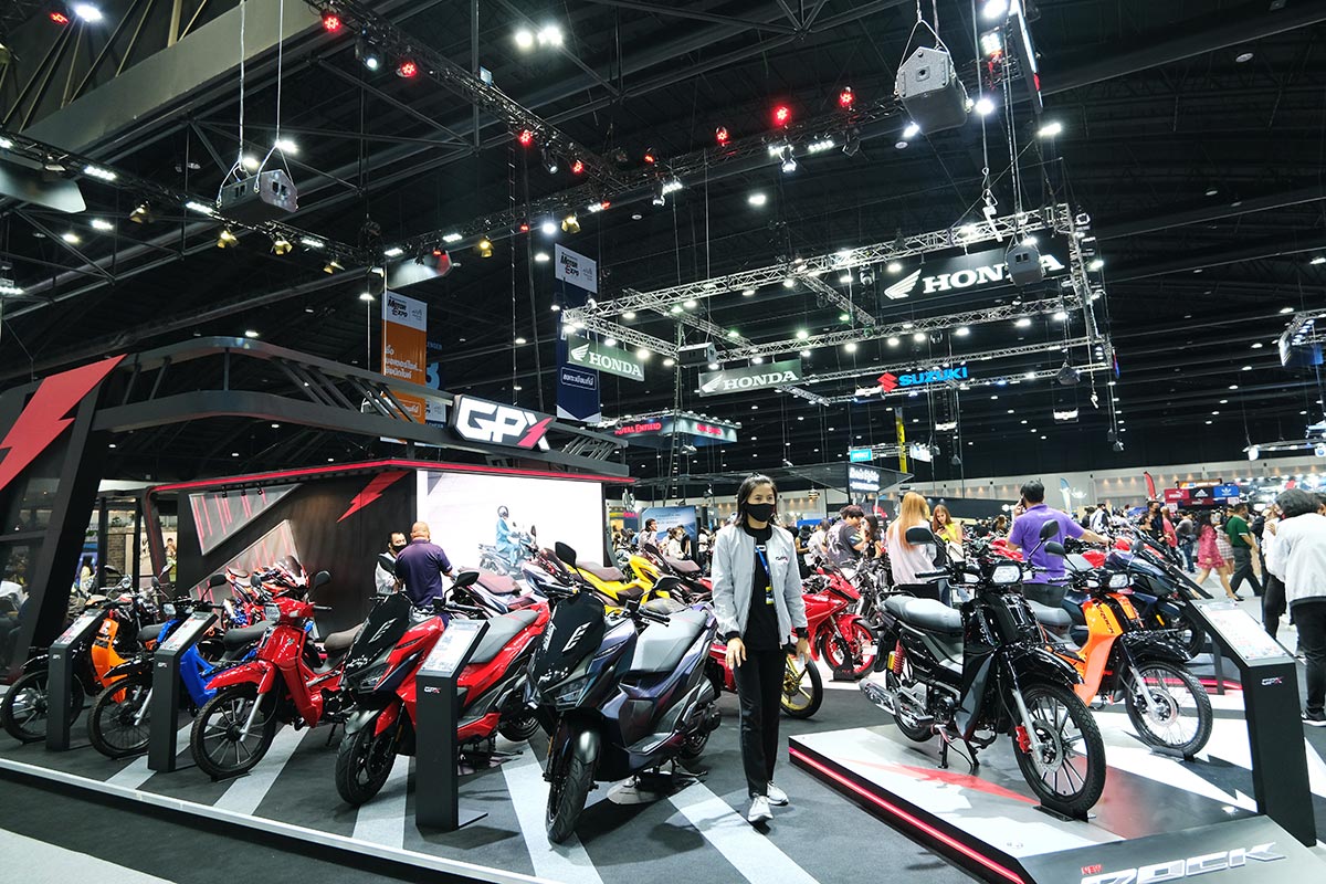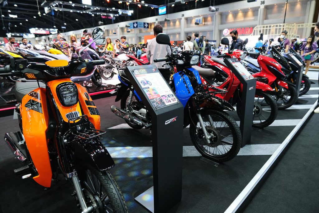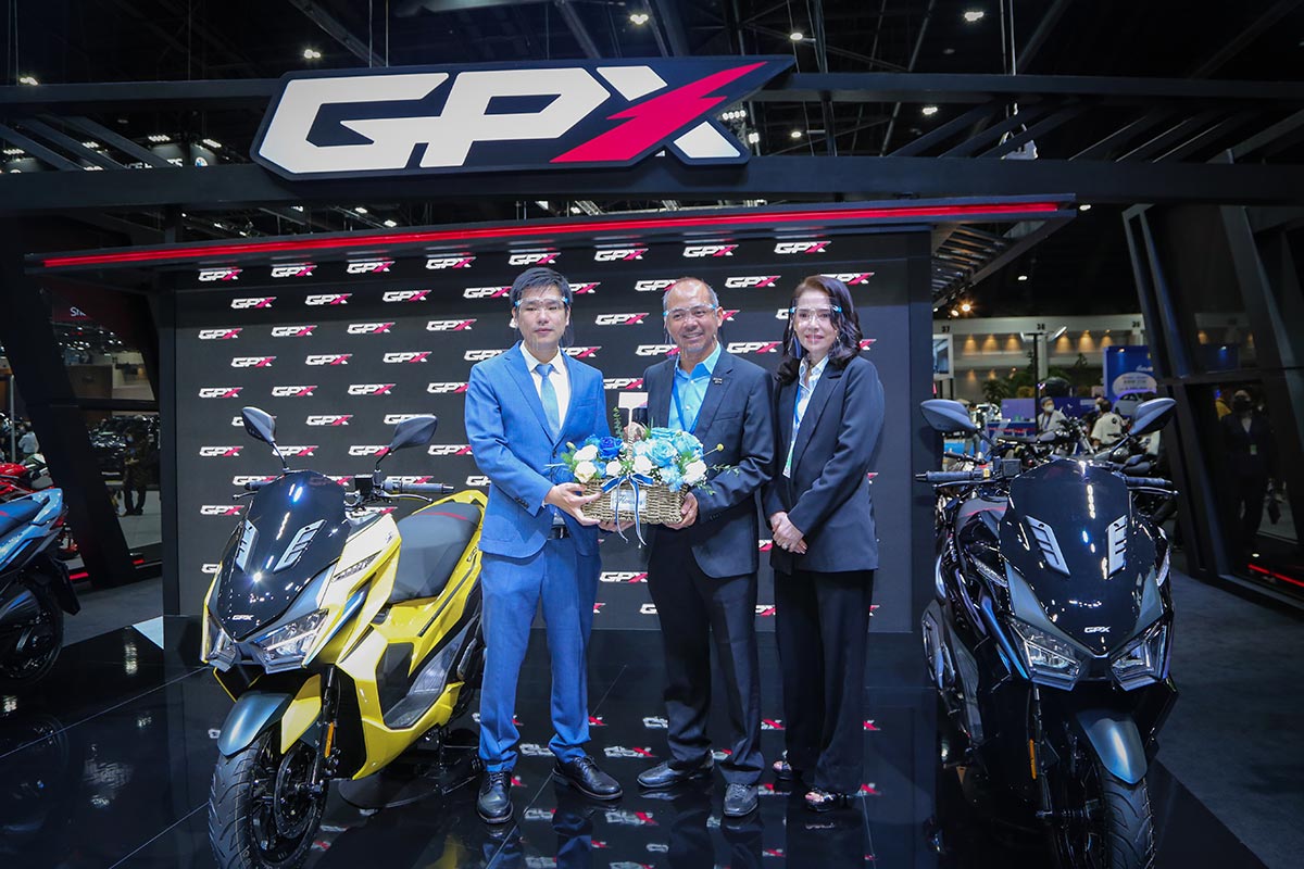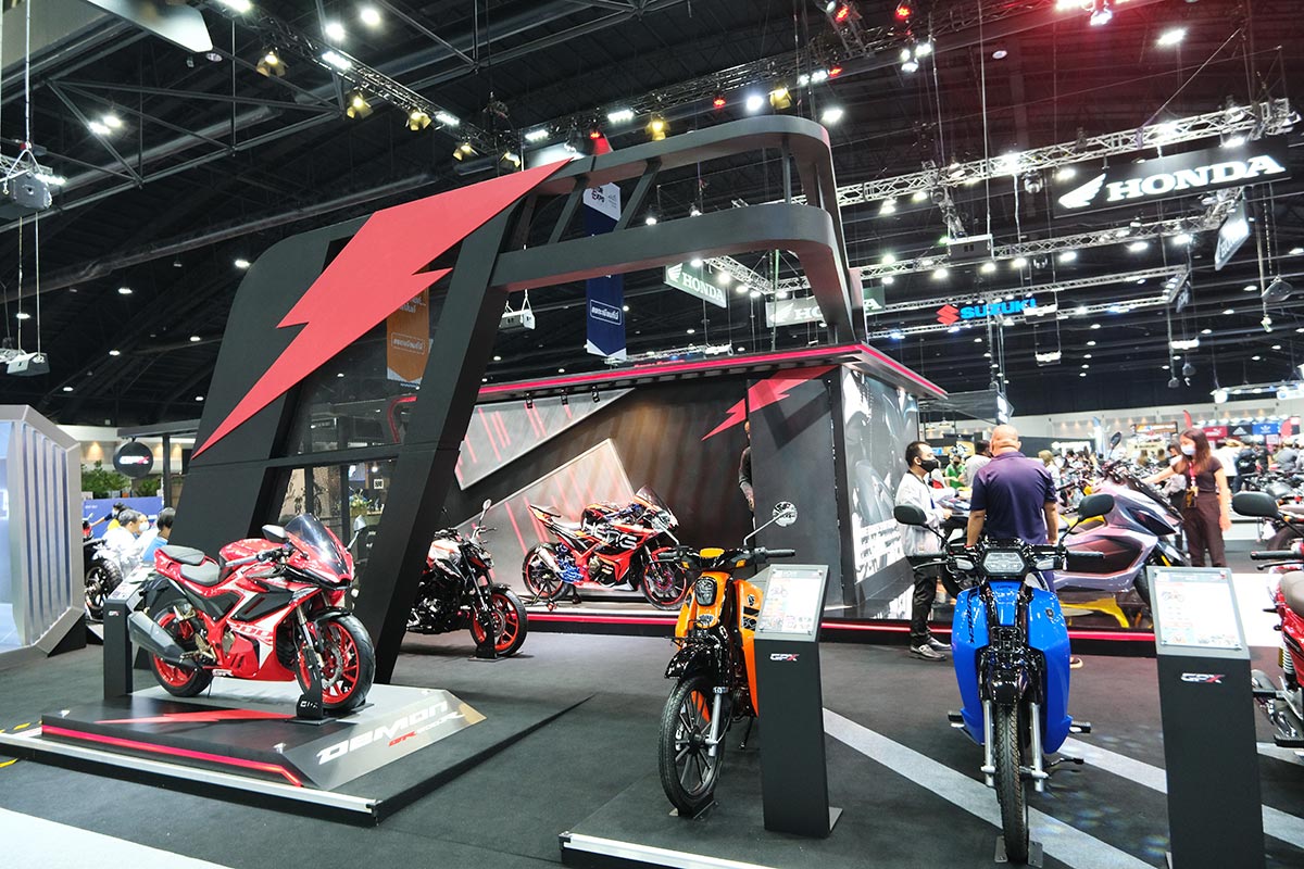 พร้อมโชว์ตัวสปอร์ตฟลูแฟริ่งNEW GPX DEMON GR200R – Da corsaที่มาพร้อมสีสันและลวดลายใหม่เพิ่มความดุดันด้วยลายเคฟล่าบนสุดแฟริ่ง2 คู่สีพิเศษคือ Rosso Red และ Carbon Black ราคา 81,500 บาทนอกจากนั้นยังได้นำฝูง GPX DRONE150 ครบทุกซีรีส์มาเป็นไฮไลต์กลางพื้นที่บูธ GPX รายล้อมด้วยรถรุ่นอื่นๆครบครัน ทั้งรถโมเพ็ดGPX ROCK , GPXLEGEND 250 TWIN II ,GPX MAD 300 MAX ,GPX RAPTOR 180 พร้อมกับ “ตัวแต่งพิเศษ” ทั้ง GR 200R สไตล์ตัวแข่งโรดเรซซิ่ง และ LEGEND 250TWIN ที่คัสตอมมาให้แฟนๆ GPX ได้ดูแนวทางกันครบแนว