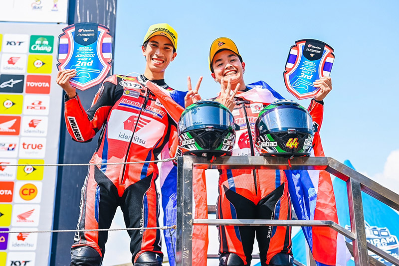 ขณะผลในรุ่น เอเชีย โปรดักชั่น 250 ซีซี (AP250) ปรากฏว่า 2 นักบิดไทยอย่าง “ข้าวกล้อง” จักรีภัทร พฤฒิสาร ดาวรุ่งจาก ฮอนด้า เรซซิ่ง ไทยแลนด์ และทีมเมทรุ่นพี่ “มุกข์” มุกข์ลดา สารพืช ยอดนักบิดสาวยกระดับผลงานแบบก้าวกระโดด พร้อมต่อสู้กับคู่แข่งอย่างดุเดือดก่อนบิดเข้าป้ายในอันดับ 2 และ 3 ตามหลังผู้ชนะอย่าง เรซ่า ดานิก้า อาห์เรน นักบิดอินโดนีเซียจาก แอสตร้า ฮอนด้า เรซซิ่ง 8.832 วินาที และ 8.868 วินาที ได้ฉลองโพเดียมโฮมเรซอย่างสุดมันส์ ด้าน “มิกซ์” ธนัช ละอองปลิว หมายเลข 11 ขยับขึ้นมาจบเรซในอันดับ 8 ตามหลัง 16.998 วินาที