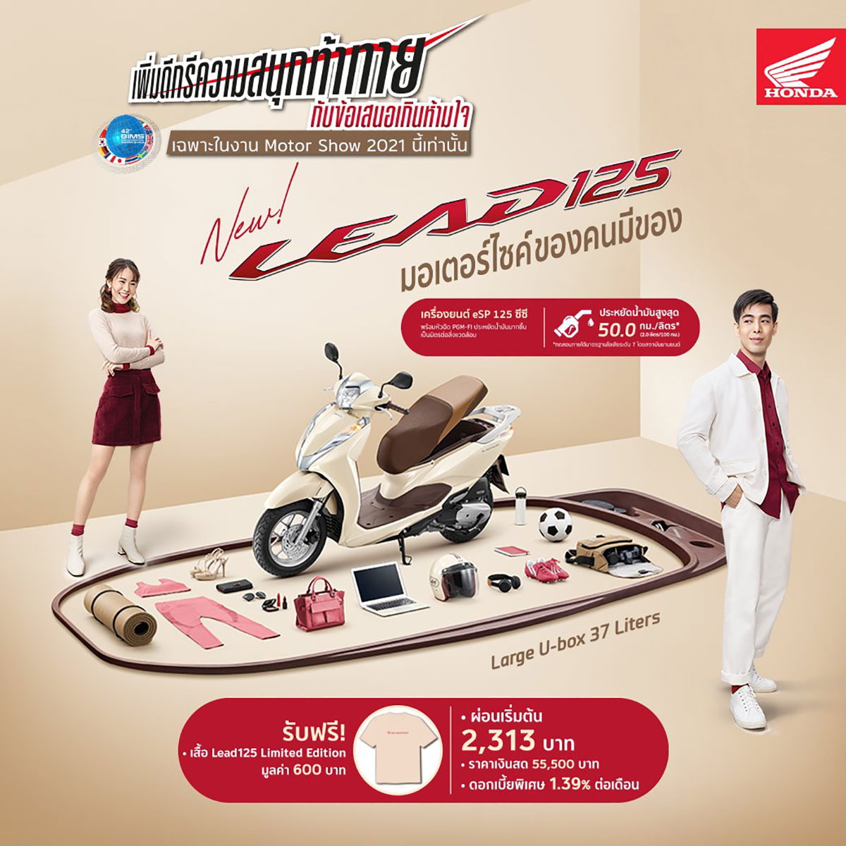 ตามด้วย New Honda LEAD125 รถ เอ.ที. รุ่นใหม่ล่าสุด ราคาเงินสด 55,500 บาท หรือเลือกรับดอกเบี้ยพิเศษ 1.39% ต่อเดือน ผ่อนเริ่มต้น 2,313 บาท และรับฟรี! เสื้อ LEAD125 Limited Edition (มูลค่า 600 บาท) ทั้งแบบซื้อเงินสดและผ่อน