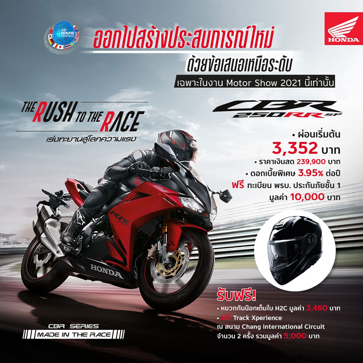 กลุ่มรถสปอร์ต แรงสุดด้วยเทคโนโลยีจากสนามแข่งในรุ่น Honda CBR250RR SP ราคาเงินสด 239,900 บาท หรือเลือกผ่อนเริ่มเพียง 3,352 บาท ดอกเบี้ยพิเศษ 3.95% ต่อปี รับฟรี! ทะเบียน + พ.ร.บ. และประกันภัยชั้น 1 (มูลค่า 10,000 บาท) รวมถึงหมวกกันน็อกเต็มใบจาก H2C มูลค่า 3,460 บาท และสิทธิ์ร่วมกิจกรรม Honda Track Xperience ที่สนามช้างฯ จำนวน 2 ครั้ง มูลค่า 5,000 บาท