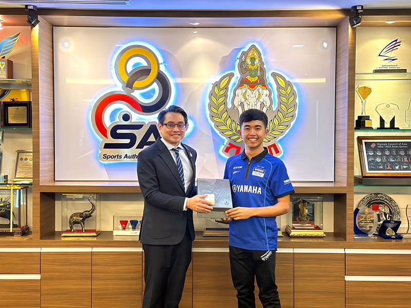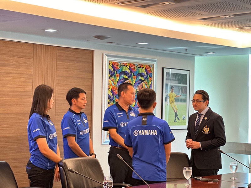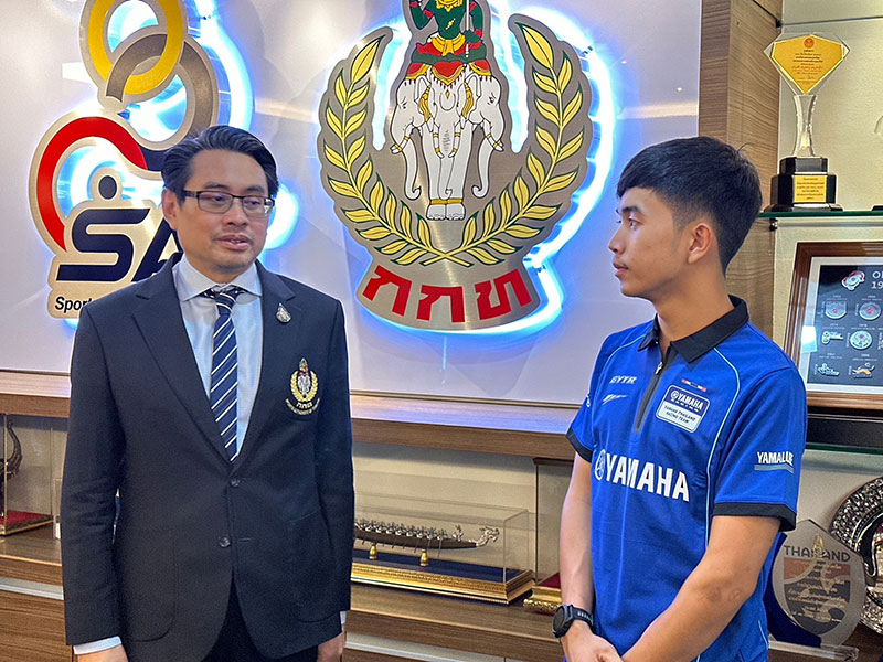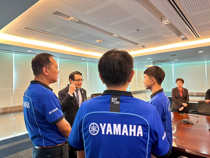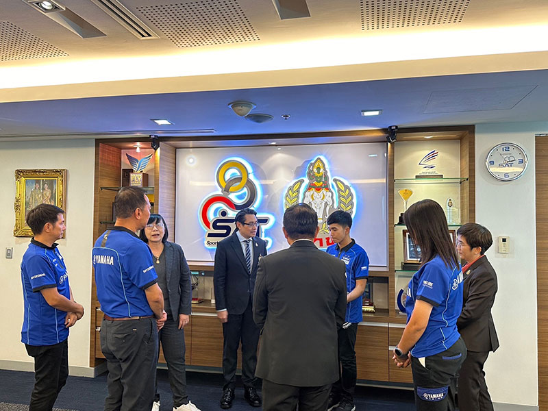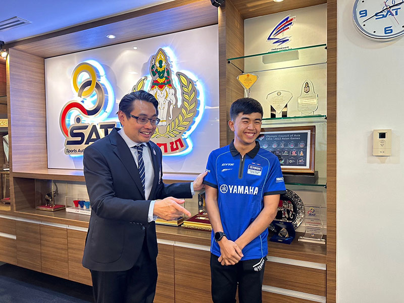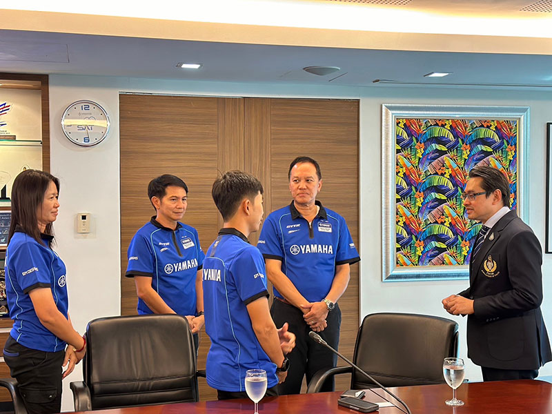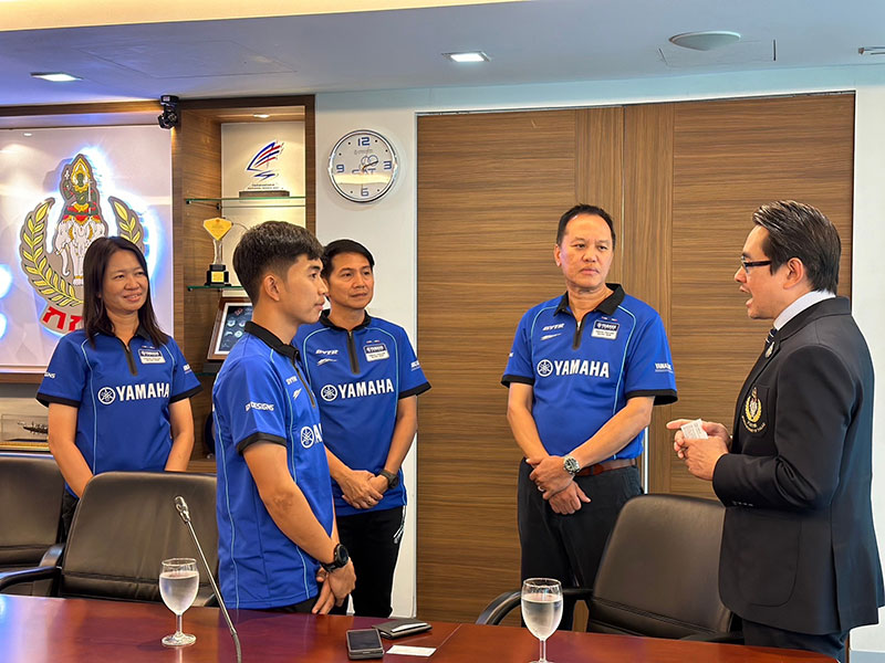 นายภาณุพล กิตติคำรณ รองผู้จัดการใหญ่ฝ่ายขาย บริการ และอะไหล่ นายวีรพงษ์ ธนากิจจานนท์ ผู้อำนวยการยามาฮ่า ไทยแลนด์ เรซซิ่งทีม พร้อมผู้บริหารระดับสูง บริษัท ไทยยามาฮ่ามอเตอร์ จำกัด พา “ไอเดีย” กฤตภัทร เขื่อนคำ เข้าพบ ดร.ก้องศักด ยอดมณี ผู้ว่าการการกีฬาแห่งประเทศไทย (กกท.) โดยการสนับสนุน “ไอเดีย” กฤตภัทร เขื่อนคำ นักแข่งดาวรุ่งในสังกัด ยามาฮ่า ไทยแลนด์ เรซซิ่งทีม ภายใต้โครงการ YAMAHA Road to the World Class ที่กำลังสร้างผลงานอย่างโดดเด่นในการแข่งขัน YAMAHA R3 bLU cRU European 2023 ลงลุยศึกการแข่งขันรถจักรยานยนต์ทางเรียบที่ยิ่งใหญ่ที่สุดของโลก MotoGP 2023 ที่ประเทศไทย ในรายการ OR Thailand Grand Prix 2023 ที่ สนามช้างฯ จ.บุรีรัมย์ ในรุ่น Moto3