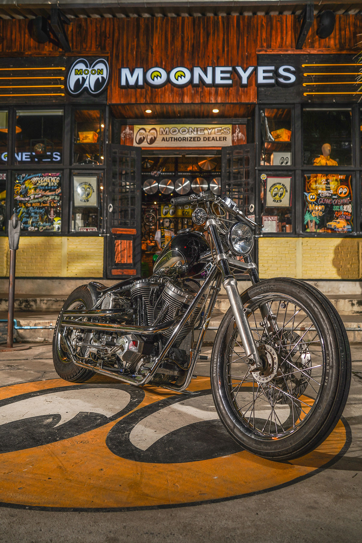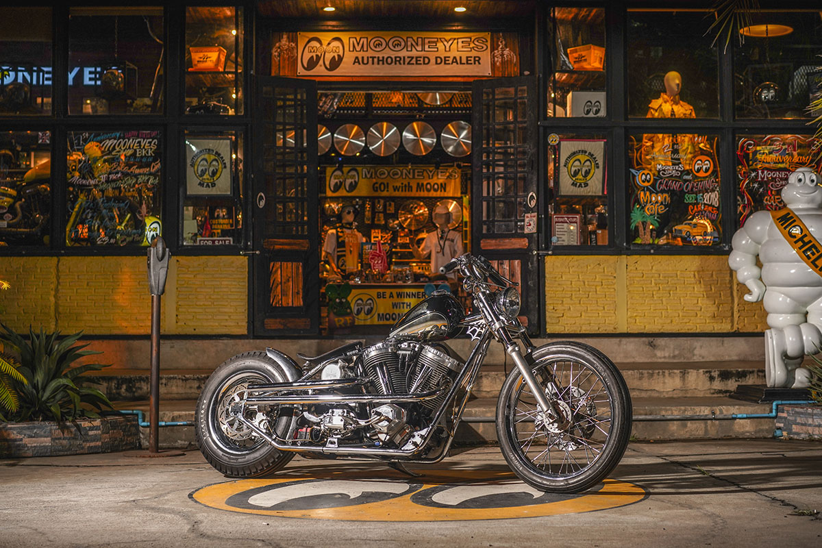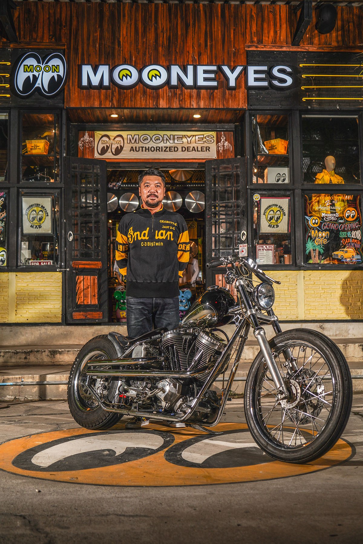 ร้าน MQQNEYE Cafe’ ตลาดรถไฟศรีนครินทร์คือจุดที่วงโคจรของผมหมุนมาพบกับ Custom คันหนึ่ง ซึ่งมี “เอกลักษณ์” มากๆ …มันถูก “เล่น” มาในสไตล์ Chopper ที่ผสานออพชั่นจาก H.D. แล้วแบ็คอัพด้วยขุมกำลังจาก Indian แน่นอน…อินเดียน ที่หมายถึงหนึ่งในต้นทางอเมริกันครุยเซอร์ผู้สร้างตำนานย้อน “ลึก” ไปได้ไม่แพ้แบรนด์ใดในโลกนี้นั่นแหละ!!