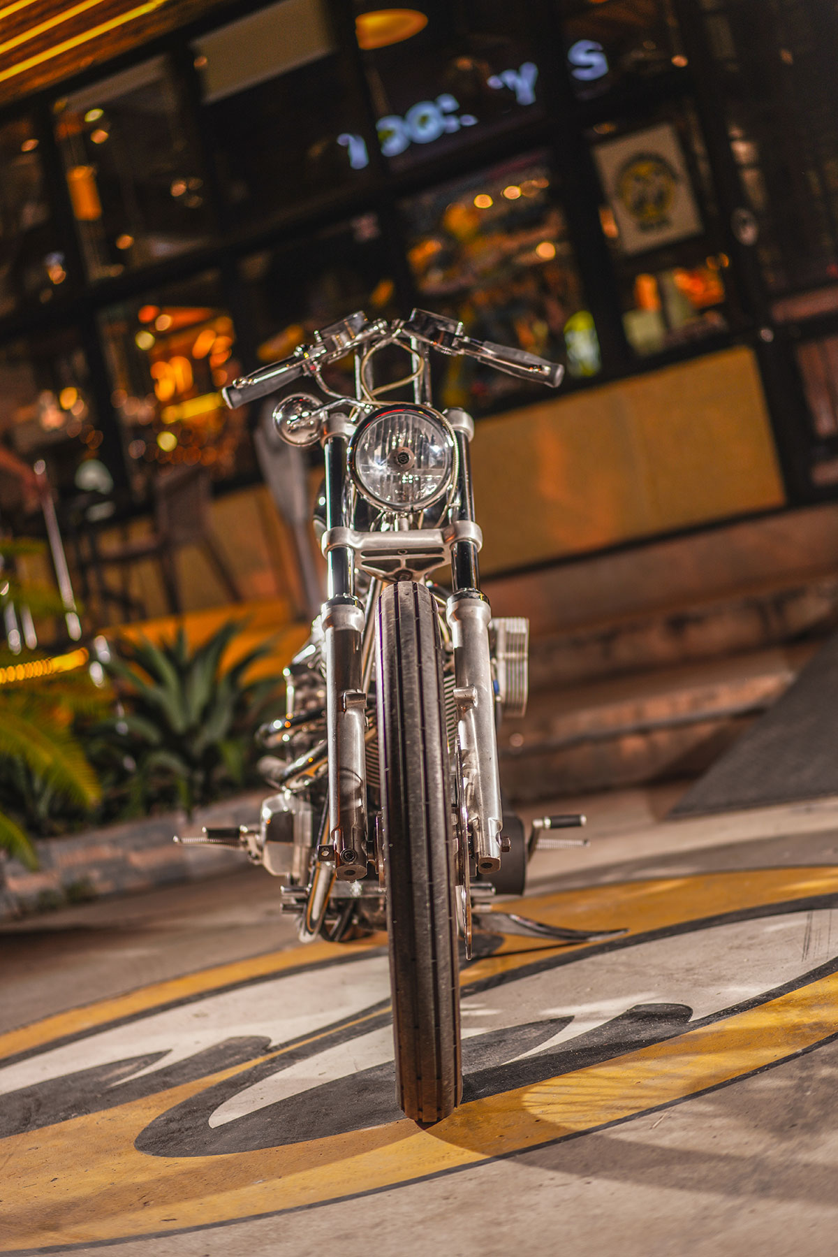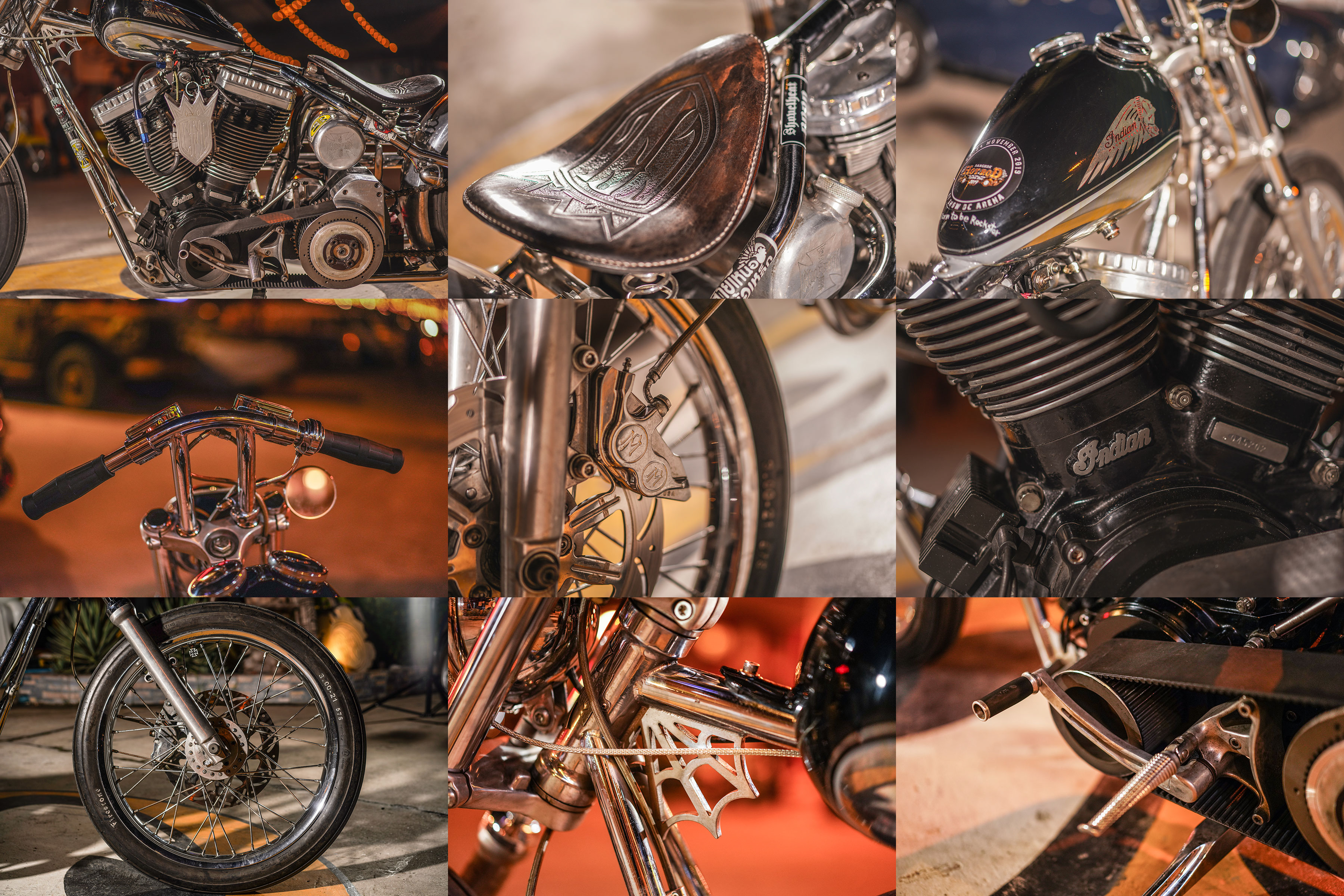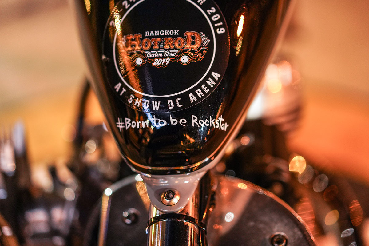 คอนเซ็ปต์ของงานชิ้นนี้คือ “Born To Be Rockstar” กับเฟรมจากสำนัก West Coat Chopper USA รุ่น “CFL 140” เป็นเฟรมสไตล์ HardTail มาพร้อมเครื่อง “Indian Power Plus 100” แบบ Open Belt ระบบกันสะเทือนหน้าเป็นโช้ค Telescopic หน้าแคบ ไฟหน้ากลมของ Harley Davidson ล้อแบบซี่ลวด หน้าขนาด 21 นิ้ว และล้อหลัง 16 นิ้ว จับคู่กับยางลายตรง Firestone ขนาด 3.00 และ 5.00 แถมมี Disk Break ทั้งหน้าและหลังเพิ่มความอุ่นใจ Handle Bar ให้อารมณ์แบบ T-Bar ปลายตกๆ มีกระจกข้างฝั่งขวาไว้ใช้งานในยามจำเป็น ถังออยล์ถูกซ่อนไว้ใต้เฟรม เบาะ เป็นเบาะแบบสปริงตามสูตร!! ถังน้ำมันสีดำทรงหยดน้ำค้างบนยอดหญ้าก่อนตกลงมาสู่พื้นดิน ที่มีฝาถัง 2 ฝั่ง แถมเพ้นท์โลโก้ Indian Motorcycle ปิดท้ายด้วยงานเดินท่อคู่ขนาบข้างให้อารมณ์ร้อนขาหน่อยๆเวลาขับขี่