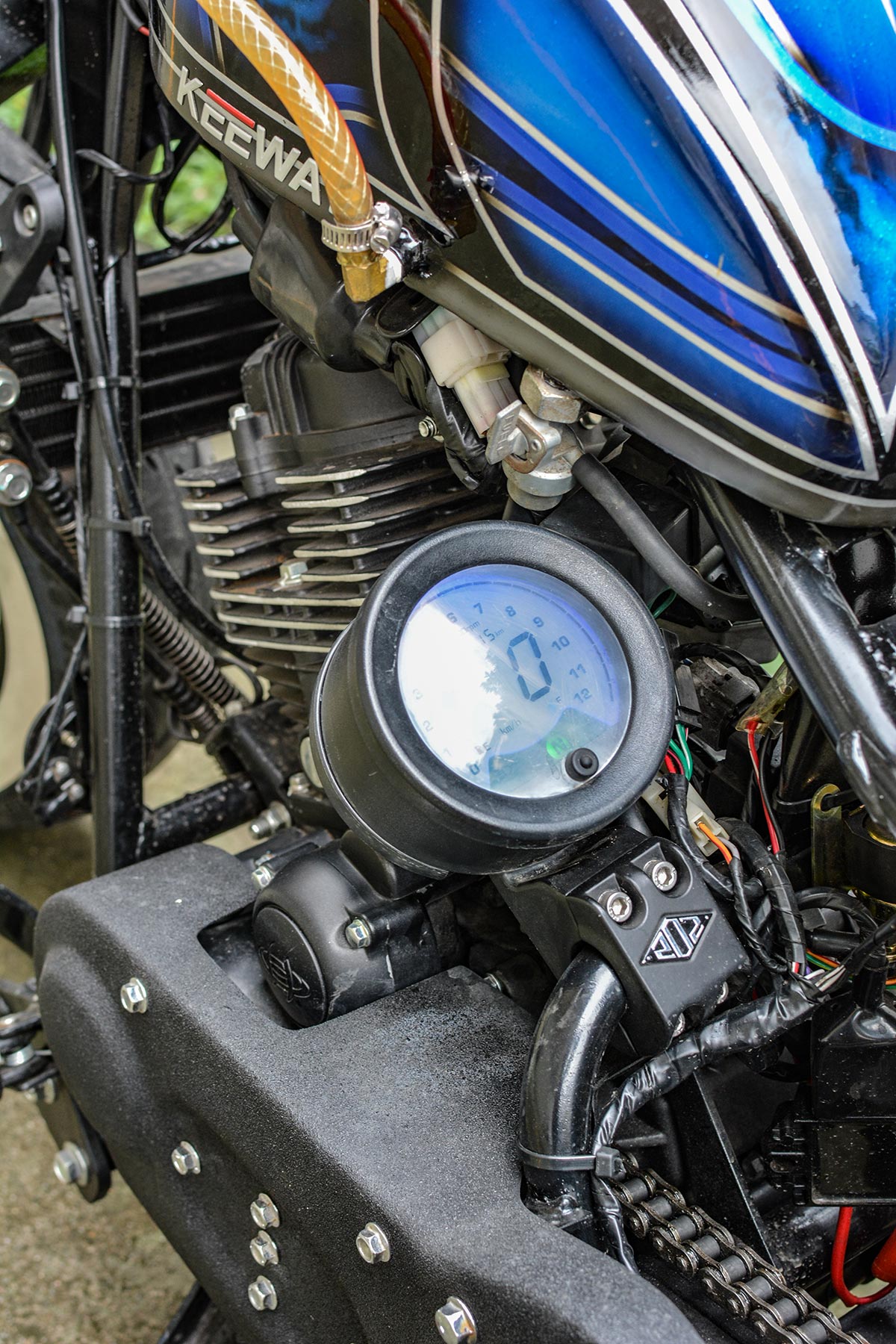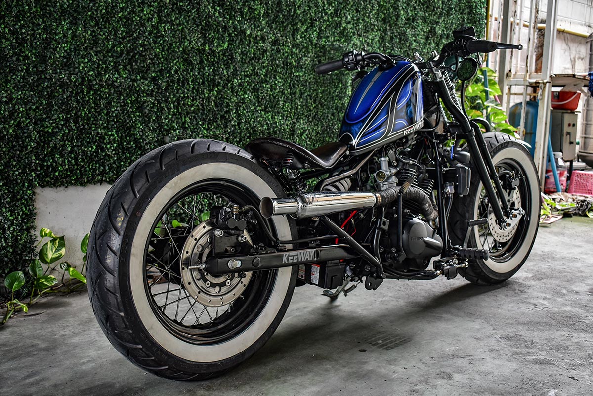 ในครั้งนี้ผมอยู่กับเจ้า K-Light202 รถจักรยานยนต์สไตล์สปอร์ตครุยเซอร์จาก KEEWAY ที่รูปลักษณ์เดิมๆ ดูเท่อยู่แล้ว แต่เมื่อถูกคัสตอมออกมาจากฝีมือของทางสำนัก Jumper Shop โดยการลงความเป็นตัวตนของผู้คัสตอมลงไปในสไตล์ของ “อเมริกัน บ๊อปเบอร์” ที่ถูกรังสรรค์ออกมาได้อย่างสวยงามและลงตัวภายใต้แนวคิดแต่งยังไงให้ถูกกฎหมาย