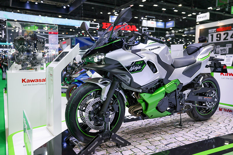 อีกหนึ่ง “ไฮไลต์” ที่สร้างกระแสกระหึ่มเมืองไทยของคาวาซากิคือ การเผยโฉม Kawasaki Ninja 7 Hybrid ซึ่งนับเป็น “สตรอง ไฮบริด” สุดล้ำรุ่นแรกที่ Kawasaki โชว์นวัตกรรมเครื่องยนต์สูบคู่สันดาปภายในขนาด 451 ซีซี. ยุคใหม่ทำงานร่วมกับมอเตอร์ไซค์ฟ้าและน้ำมันเชื้อเพลิงกลายเป็นการ E Boost พลังให้เทียบเท่ารถขนาด 1000 ซีซี. พร้อมโหมดการขับขี่ที่เลือกเล่นได้หลากหลายรูปแบบ พร้อมกันนี้ยังมีการประกาศเตรียมวางจำหน่าย(จำนวนจำกัด) NINJA E-1 มอเตอร์ไซค์ EV ในเรนจ์ราคา 2.5-2.7 แสนบาท โดยพร้อมส่งมอบในไตรมาส 3 ของปีนี้ด้วยเช่นกัน