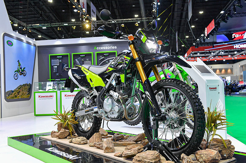 ต่อด้วยโซนรถจักรยานยนต์สายลุยกับการเปิดผ้าคลุม KLX 230 SE ดูอัลเพอร์โพสไซซ์เล็กสเปกแรงมาพร้อมฟังก์ชันใหม่ๆ อาทิ หน้าจอดิจิทัลสามารถเชื่อมต่อโทรศัพท์ ปุ่มเปิด-ปิดระบบ ABS ได้ ระบบกันสะเทือนหน้าแบบ USD บอดี้พาร์ทปรับให้กระชับน่าใช้มากขึ้น เบาะนั่งได้รับแรงบันดาลใจจากรถสูตร ซึ่งจะวางจำหน่ายทั้งรุ่น SE และ Standard โดยในโซนนี้ยังมี รถสูตร KX250F เวอร์ชันครบรอบ 50 ปี (เข้าไทยเพียง 20 คัน) และ KLX140 RF ตัวลุยเสื้อลมรุ่นใหม่ รวมถึง KLR650 ดูอัลเพอร์โพสสูบโต มาจัดแสดงครบไลน์อัพ