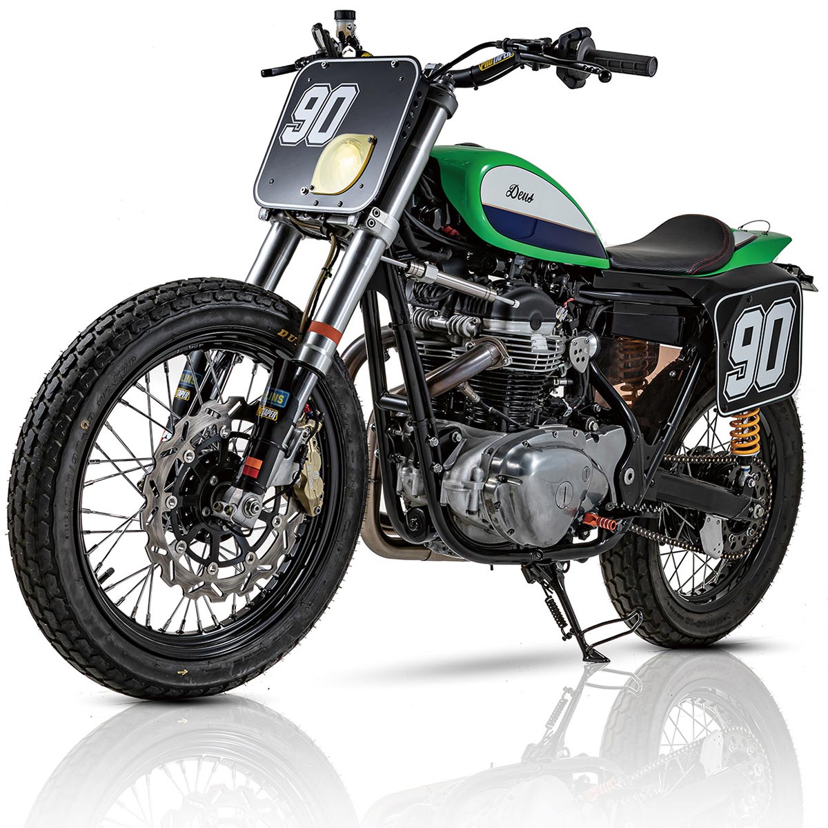 จากพื้นฐาน Kawasaki W800 ถูกฉีกความเป็น W800 ดั้งเดิม ไปสู่มาดเฟี้ยวแบบ flat-tracker แน่ละโฉมหลักๆมีการโยกย้ายออกแทบเกลี้ยง เริ่มที่ ไฟหน้าทำใหม่แบบป้ายตัวแข่งเติมเบอร์ แล้วยัดหลอดฮาโลเจนไว้ที่มุมขวาล่าง แฮนด์แบบแฟลทแทรคปรับระดับได้จาก PRO TAPER ติดตั้งกันสะบัดจาก NHK ต่อเนื่องถังน้ำมันตีใหม่ ทำเพลทสำหรับบิลด์อินชุดเรือนไมล์ดิจิตอลเอาไว้อย่างพอเหมาะ ส่วนชุดเบาะปาดบางตอนเดี่ยว ท้ายสร้างขึ้นใหม่ใส่ไฟท้าย LED ขณะที่ วงล้อหน้าของเดิม 19 นิ้ว หลัง 18 ซี่ลวด แต่ทำสีดำ รัดด้วยยาง Dunlop บั้งใหญ่ๆสไตล์เดิร์ทแทรค ส่วนช่วงล่างจัดหนักด้วยคู่โช้คหน้า Showa หัวกลับ โช้คหลังเล่น Ohlins พร้อมชุดเบรกปั๊มบน-ล่าง Brembo และจาน 320 มม.