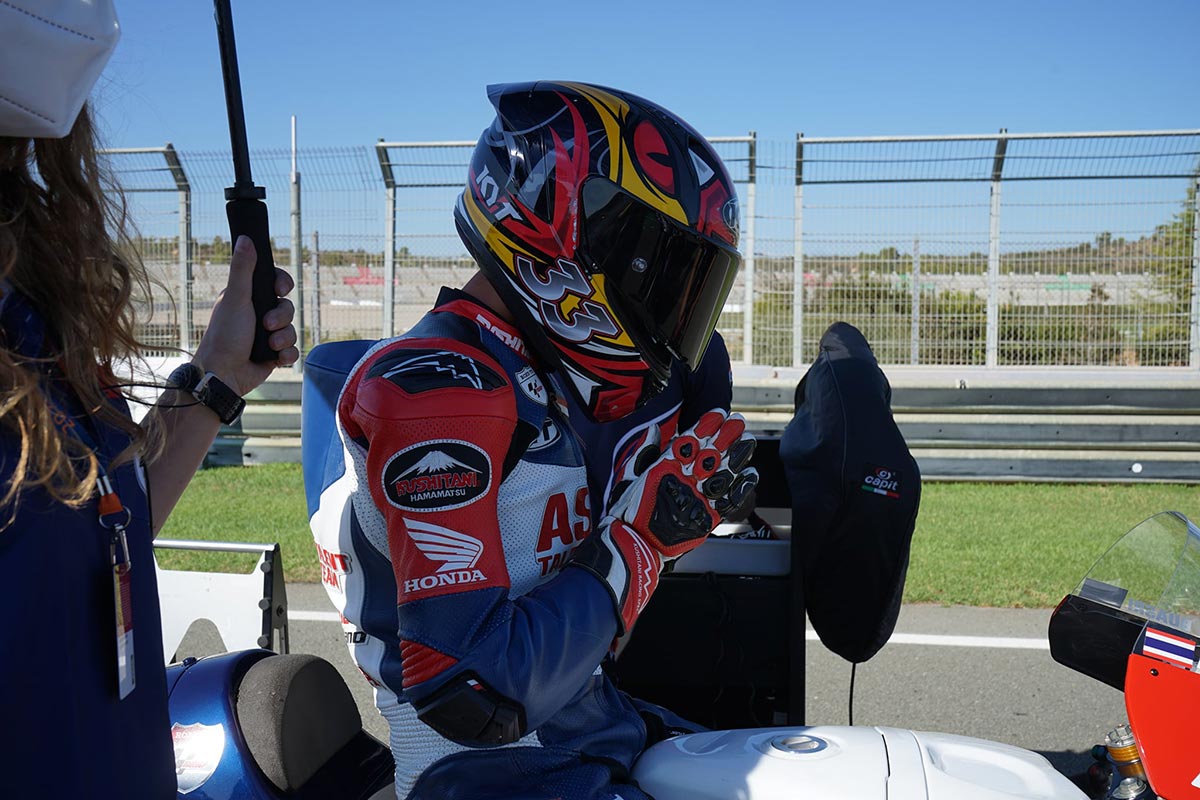 เจ้าของรถแข่ง Honda NSF250RW หมายเลข 33 กล่าวว่า “นับเป็นประสบการณ์ที่ล้ำค่ามากครับ สำหรับการได้ลงแข่งขันบนเวทีใหญ่ที่ใช้สนามเดียวกับโมโตจีพี เพียงแต่น่าเสียดายที่ร่างกายของผมมีอาการบาดเจ็บ จากอุบัติเหตุที่เกิดขึ้นในศึกรุกกีส์ คัพ ก่อนเข้าร่วมรายการนี้เพียงไม่กี่วัน ทำให้ไม่มีเวลาพักฟื้นเท่าที่ควรครับ”