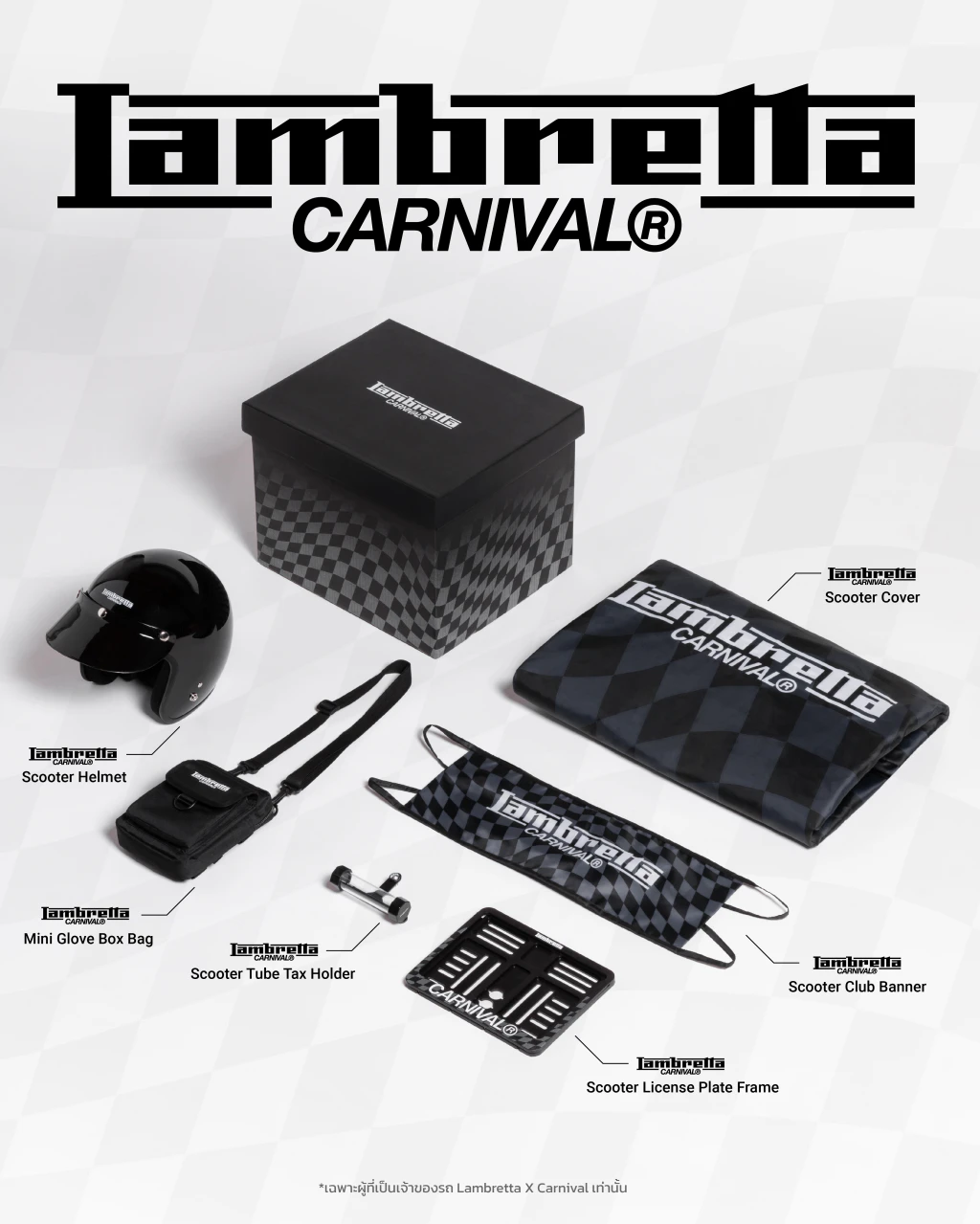 สำหรับรุ่นพิเศษนี้ ผลิตเพียง 199 คันในโลก! ซึ่งทุกคันจะมีเพลทรัน Serial Number ตั้งแต่ 001–199 นอกจากนี้ยังมาพร้อมกับคอลเลกชันพิเศษ CARNIVAL x LAMBRETTA EXCLUSIVE BOX SET ประกอบด้วยกรอบป้ายทะเบียน ที่ใส่ป้ายภาษี กระเป๋าสะพายใบเล็ก ผ้าคลุมรถ คลับแบนเนอร์ และหมวกกันน็อก Carnival x Lambretta ที่มีมาให้พิเศษเฉพาะผู้ที่เป็นเจ้าของรถรุ่นนี้เท่านั้น ตอกย้ำความเป็นแรร์ไอเทม ที่เหล่านักสะสมและแฟน ๆ ของทั้งสองแบรนด์ไม่ควรพลาด!