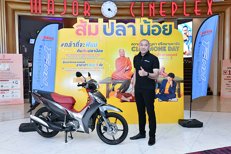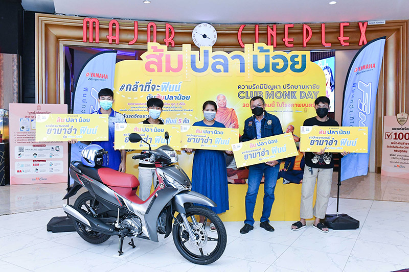 นายพลัฏฐ์ ประวีร์ชานนท์ ผู้จัดการทั่วไปฝ่ายการตลาดกลุ่มรถสปอร์ตและกลุ่มรถครอบครัว บริษัท ไทยยามาฮ่ามอเตอร์ จำกัด ร่วมกับ คุณปัญชลีย์ นิธิจิระโรจน์ กรรมการผู้จัดการ และผู้อำนวยการผลิต บริษัท เอ็ม เทอร์ตี้ไนน์ จำกัด (M39) ถ่ายภาพและแสดงความยินดีกับ 5 ผู้โชคดีที่ได้รับรถจักรยานยนต์ ยามาฮ่า “ฟินน์” จากการส่งตั๋วชมภาพยนตร์เรื่อง “ส้มปลาน้อย” ที่เข้ามารับชม ในเครือ เมเจอร์ซีนีเพล็กซ์ ทุกสาขาทั่วประเทศ ระหว่างวันที่ 30 ธันวาคม 2564 – 31 มกราคม 2565