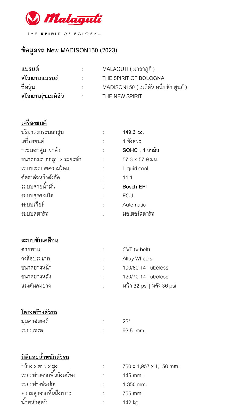 สำหรับใครที่สนใจสกู๊ตเตอร์สปอร์ตพรีเมียม สัญชาติอิตาเลียน อย่าง New MADISON 150ก็สามารถชมตัวจริงหรือทดลองขับขี่ได้ที่ตัวแทนจำหน่าย MALAGUTI ทั่วประเทศ